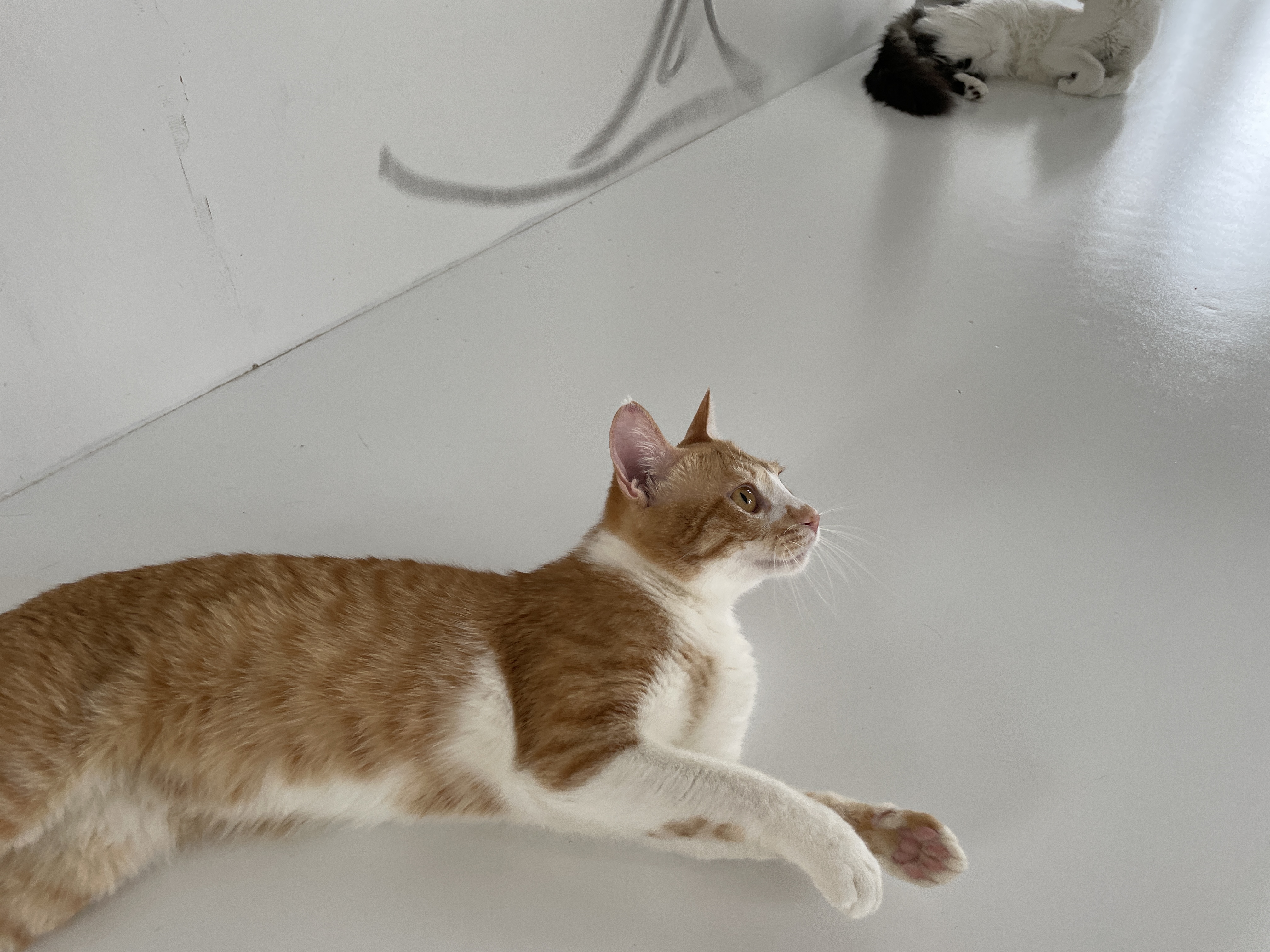 위에서 주무시던 치즈냥이 형제(자매?남매?) 두분 내려오셨습니댜