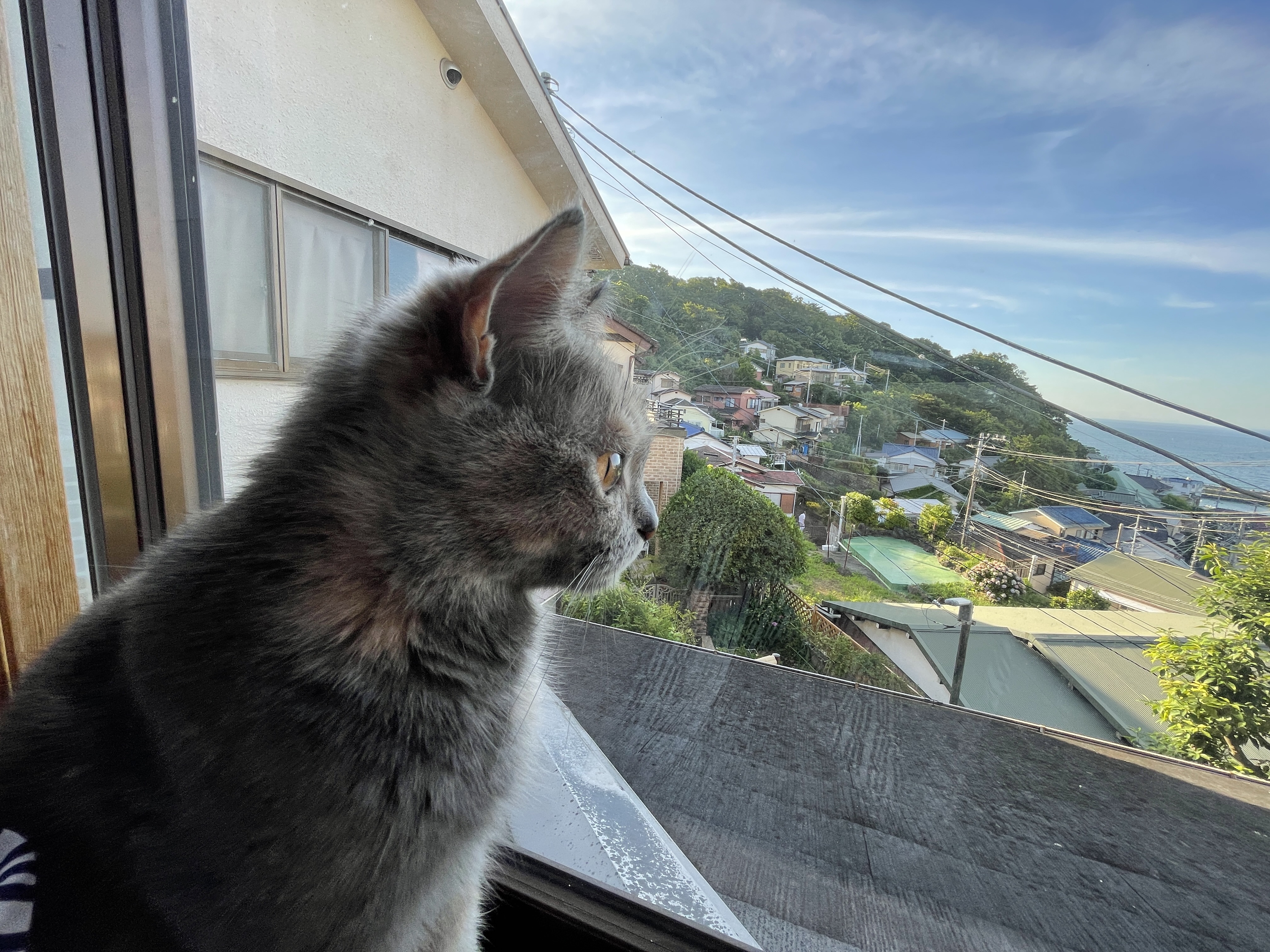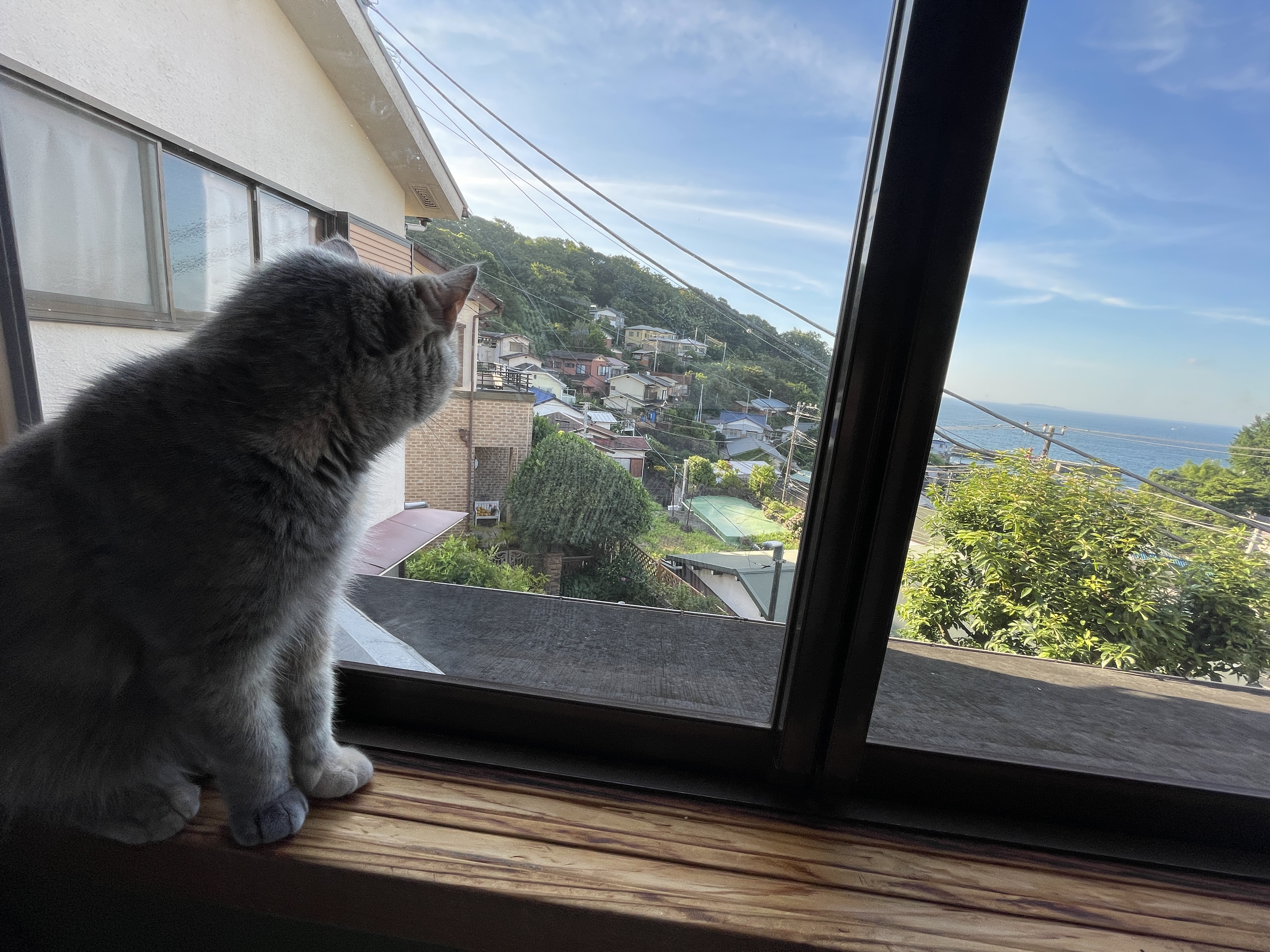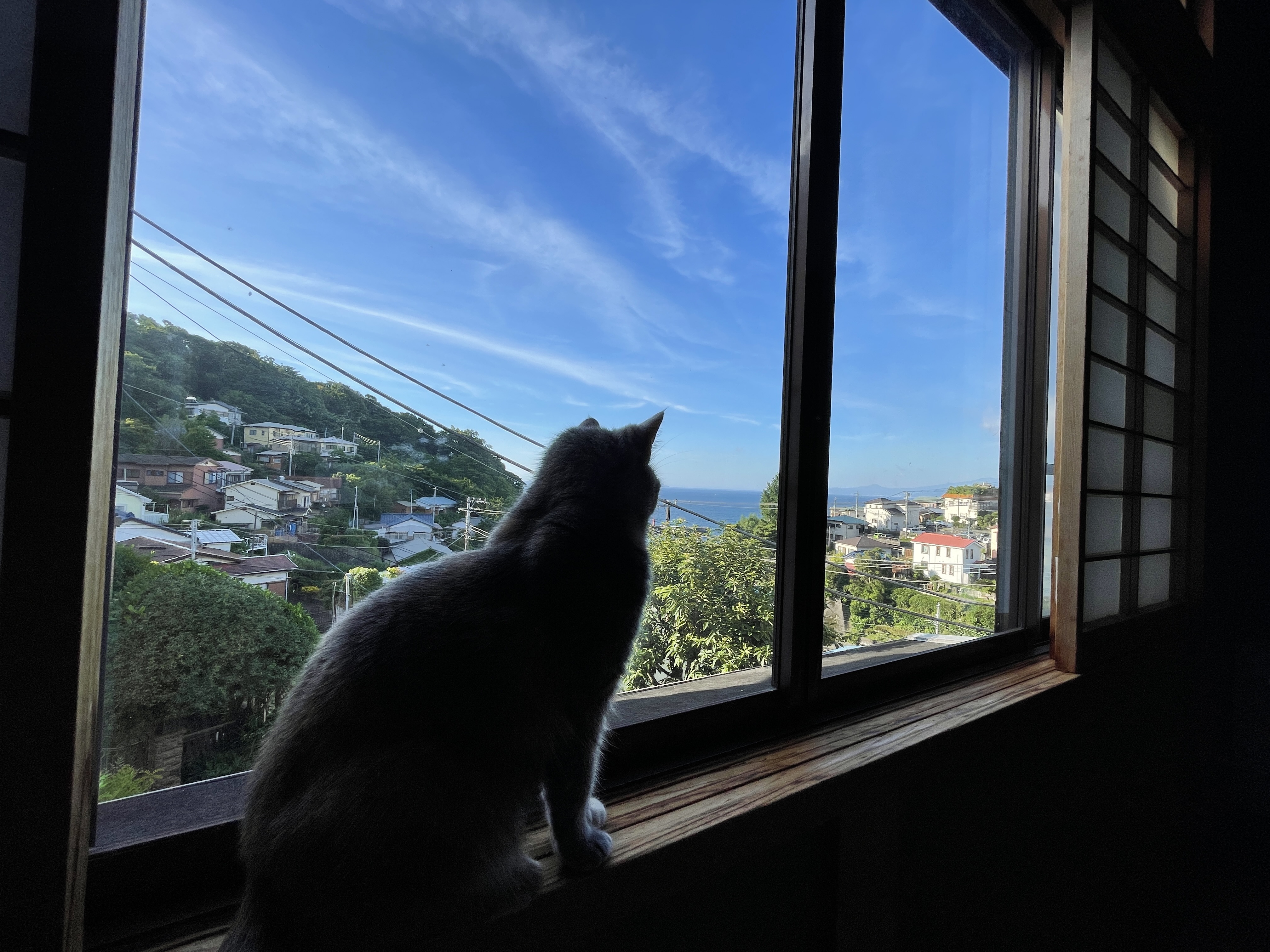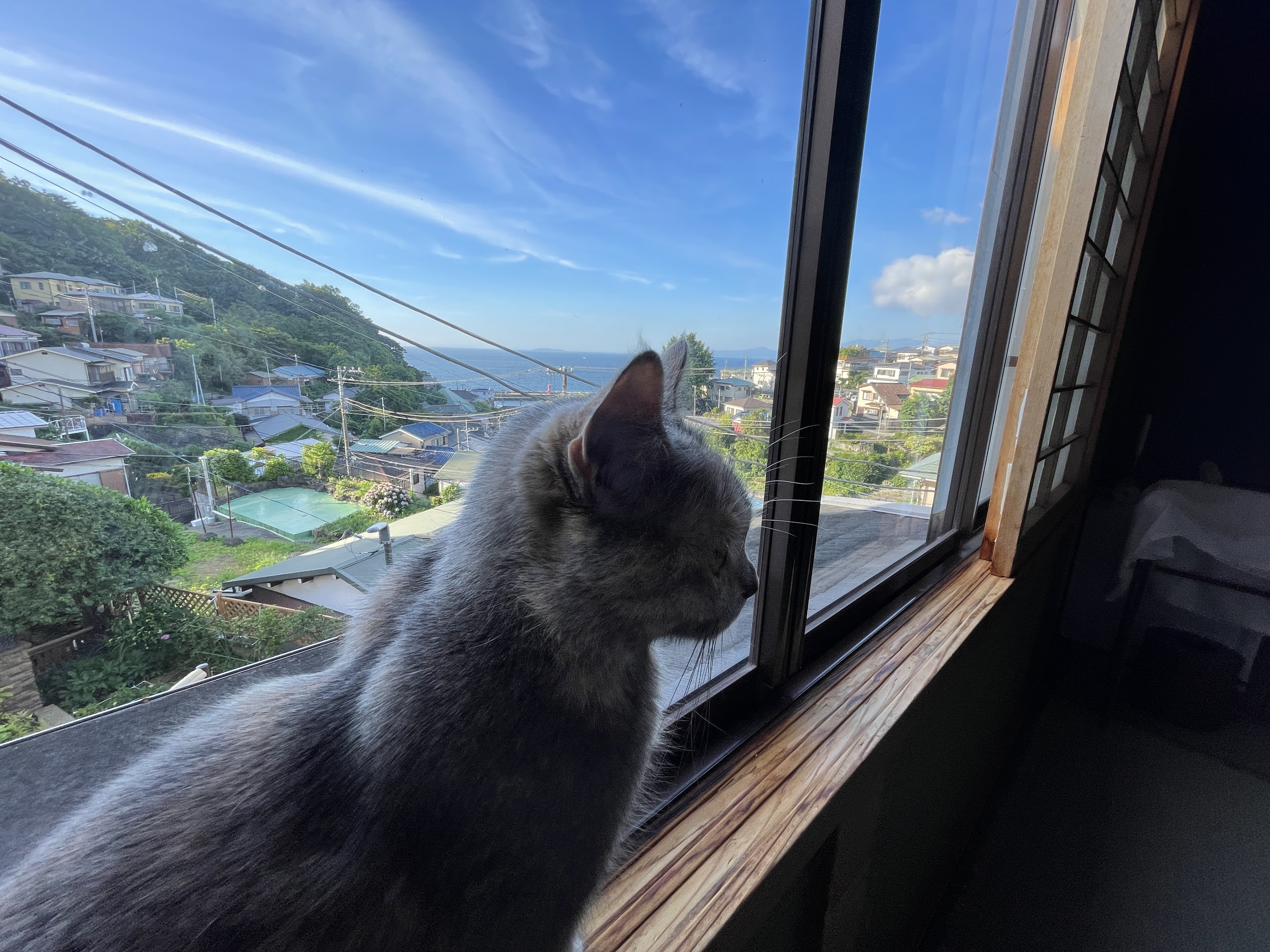 냥이와 묵을 수 있는 숙박에서 아침이 밝고 안쪽 덧문을 열어줬더니 바로 뷰 감상 하시는 낭만 고양이 요시노 님