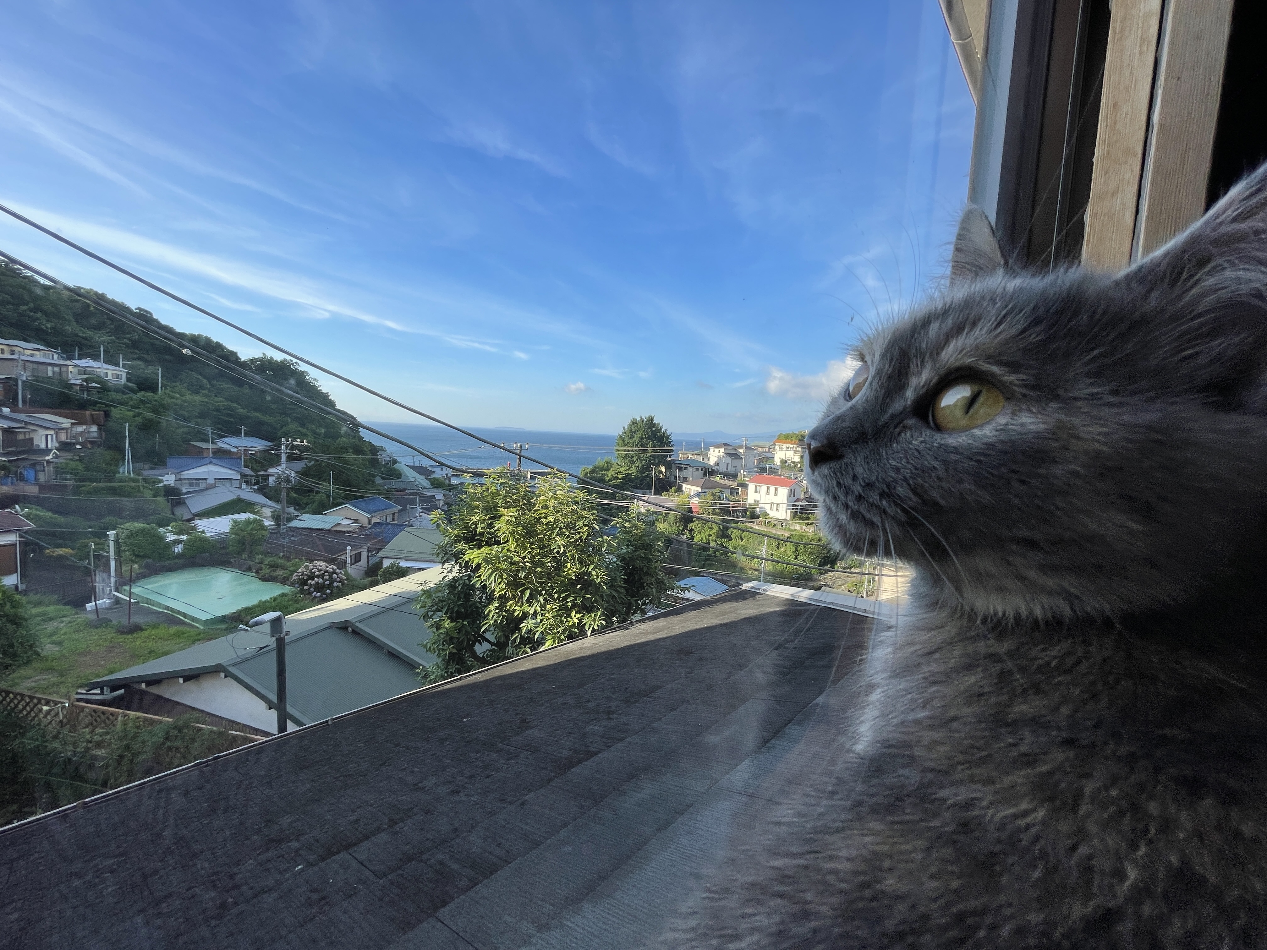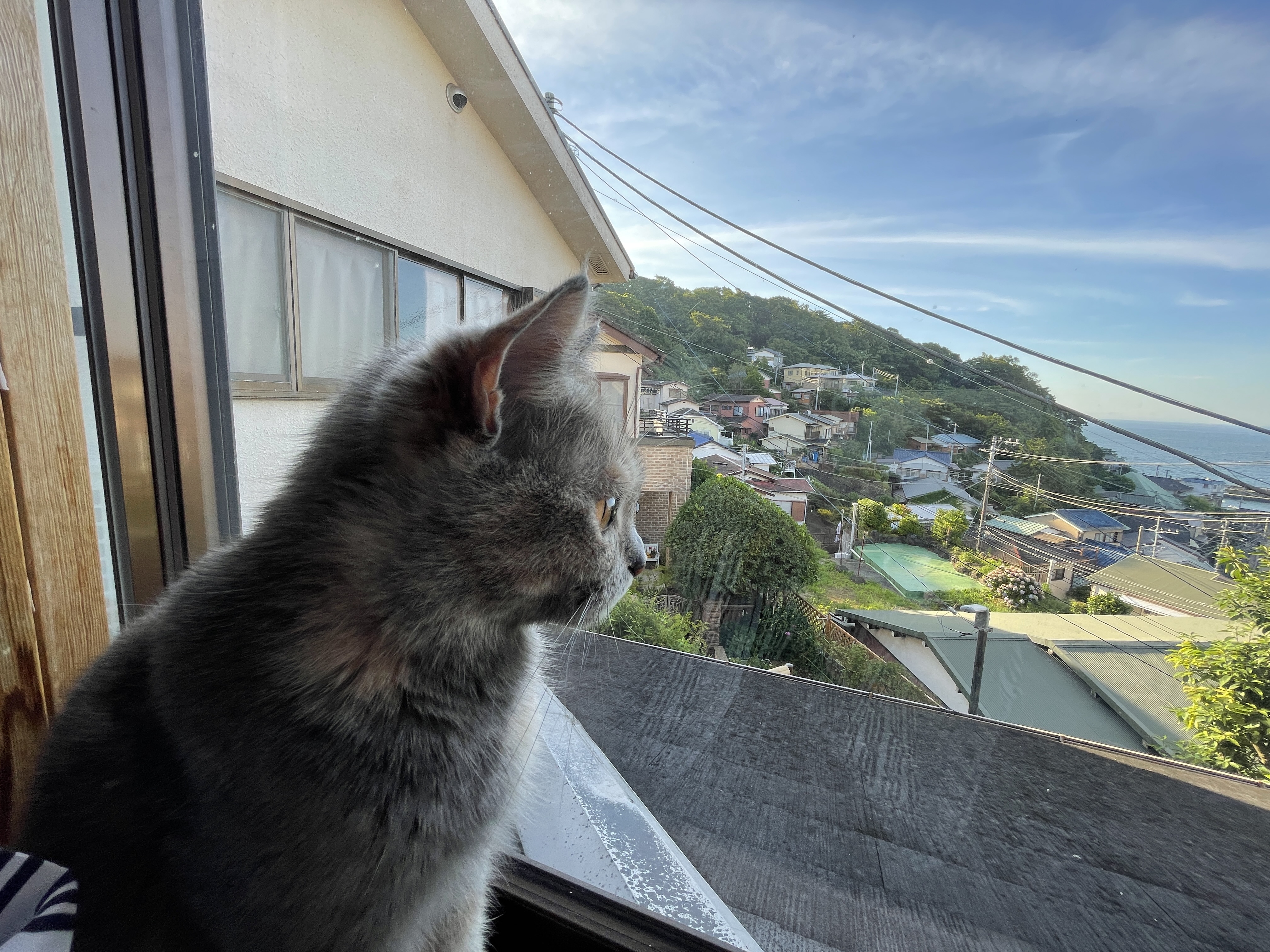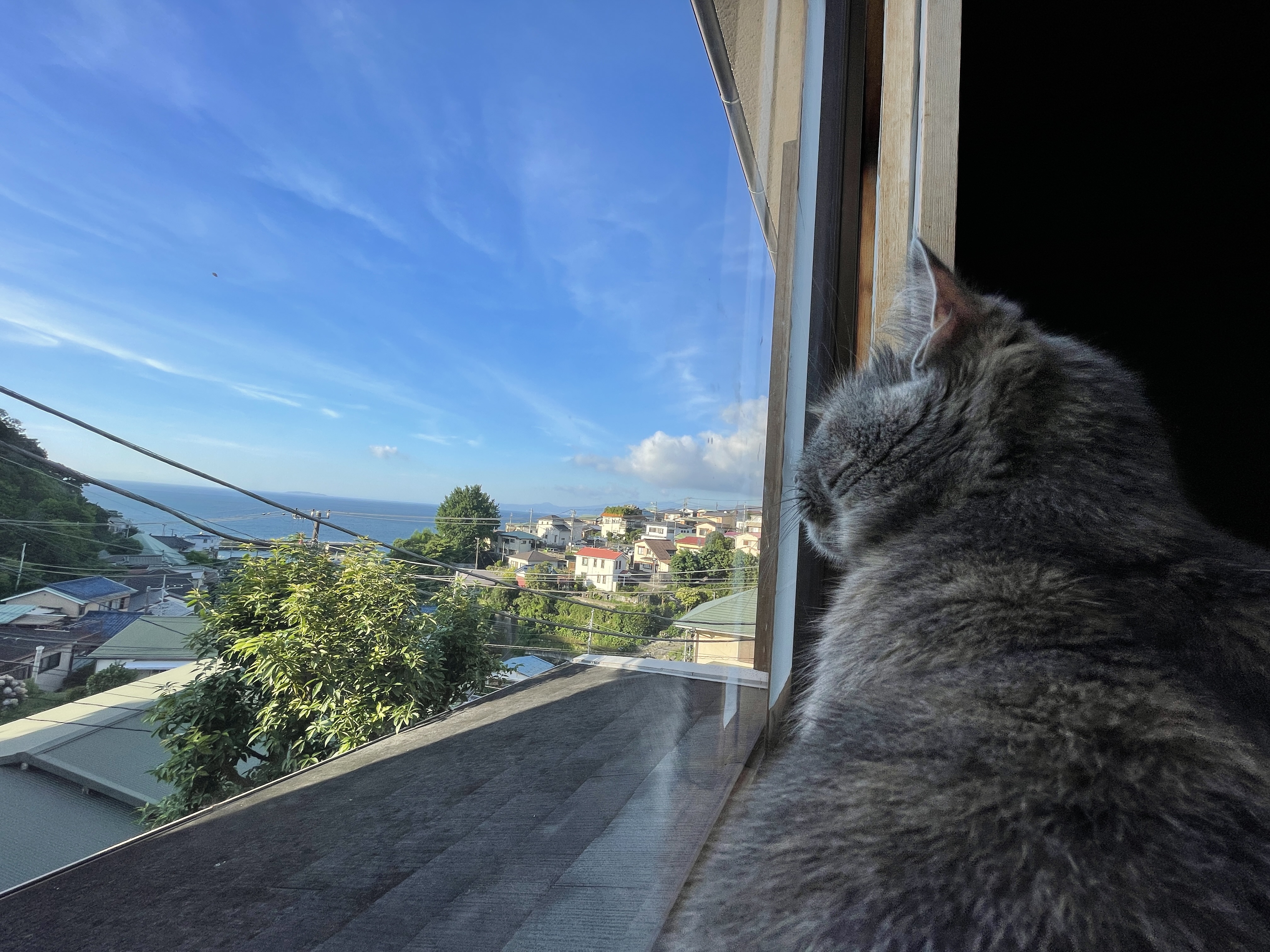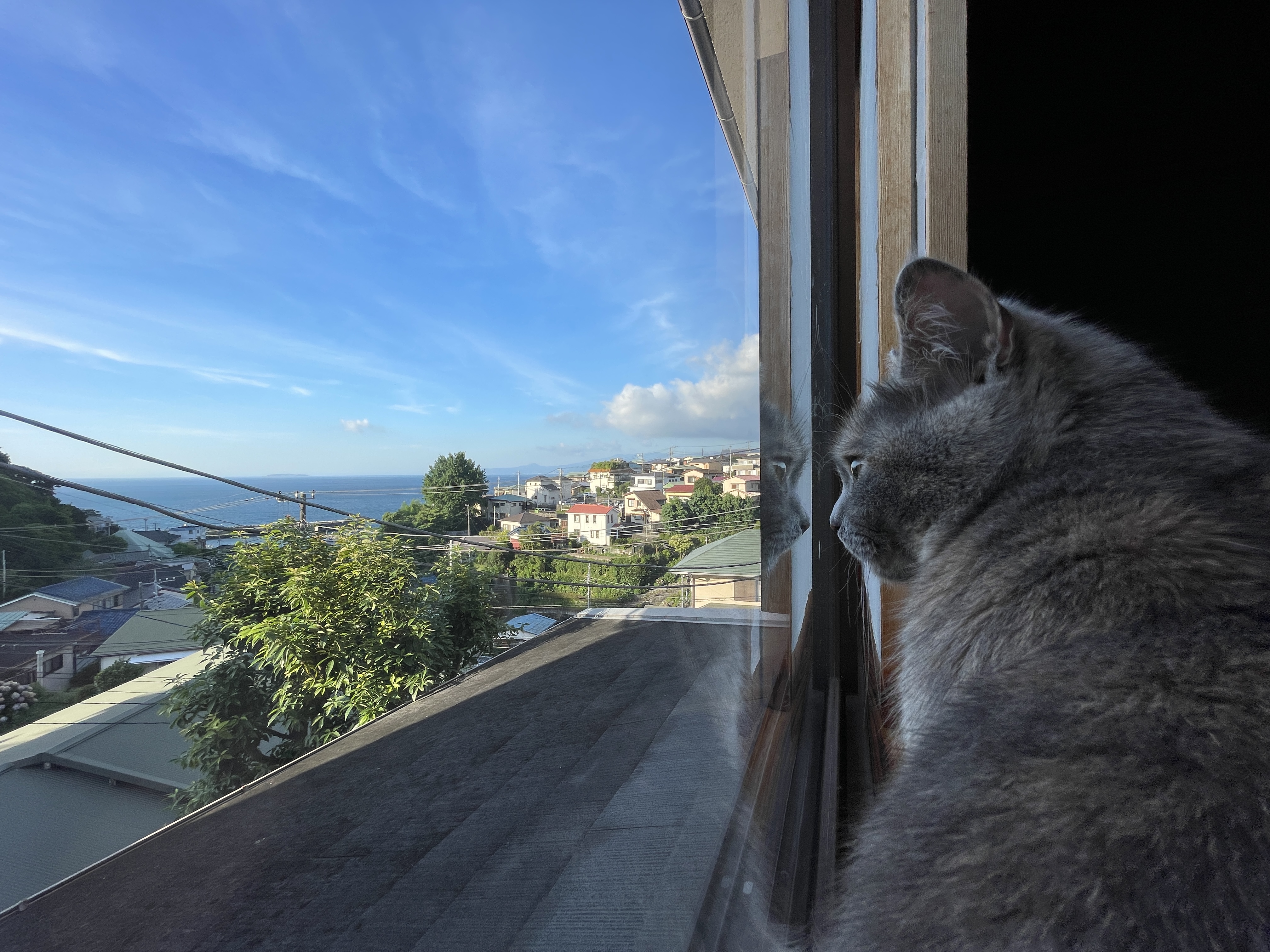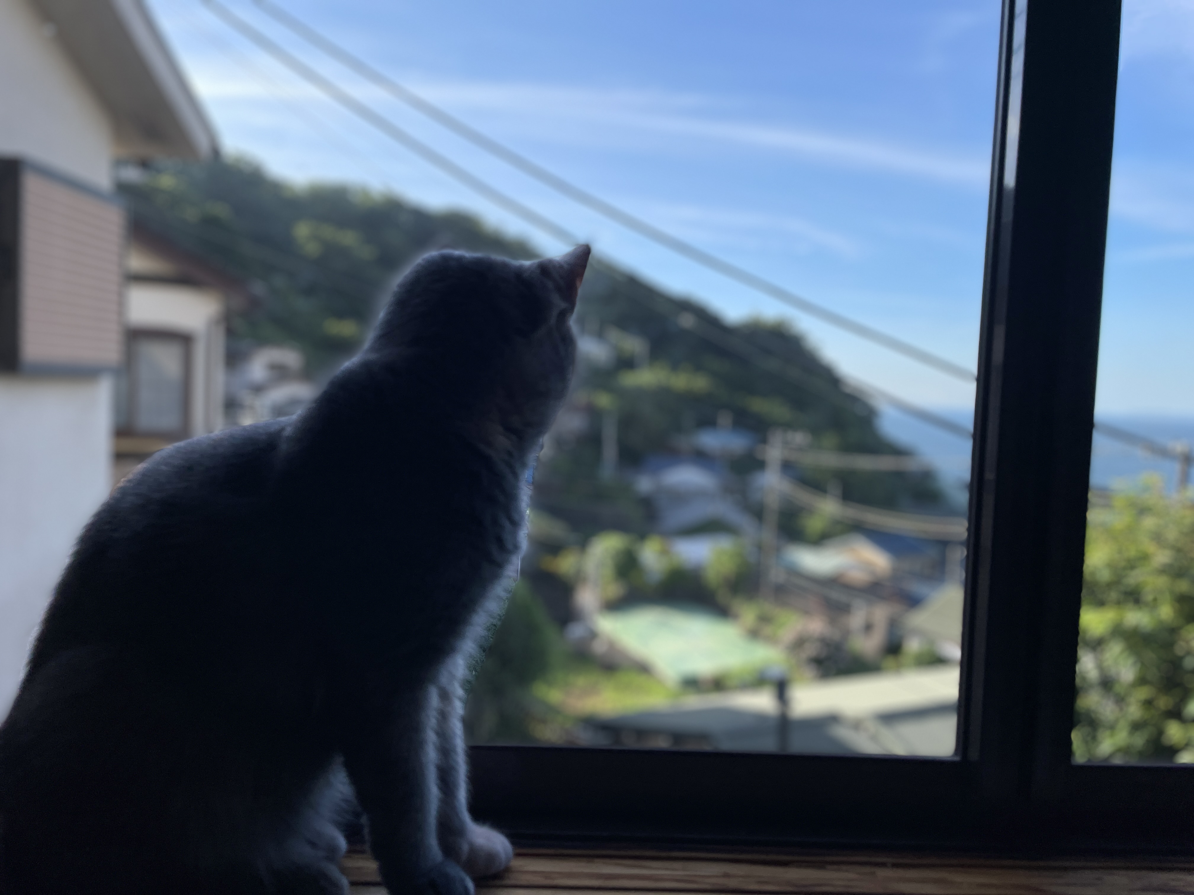 냥이와 묵을 수 있는 숙박에서 아침이 밝고 안쪽 덧문을 열어줬더니 바로 뷰 감상 하시는 낭만 고양이 요시노 님