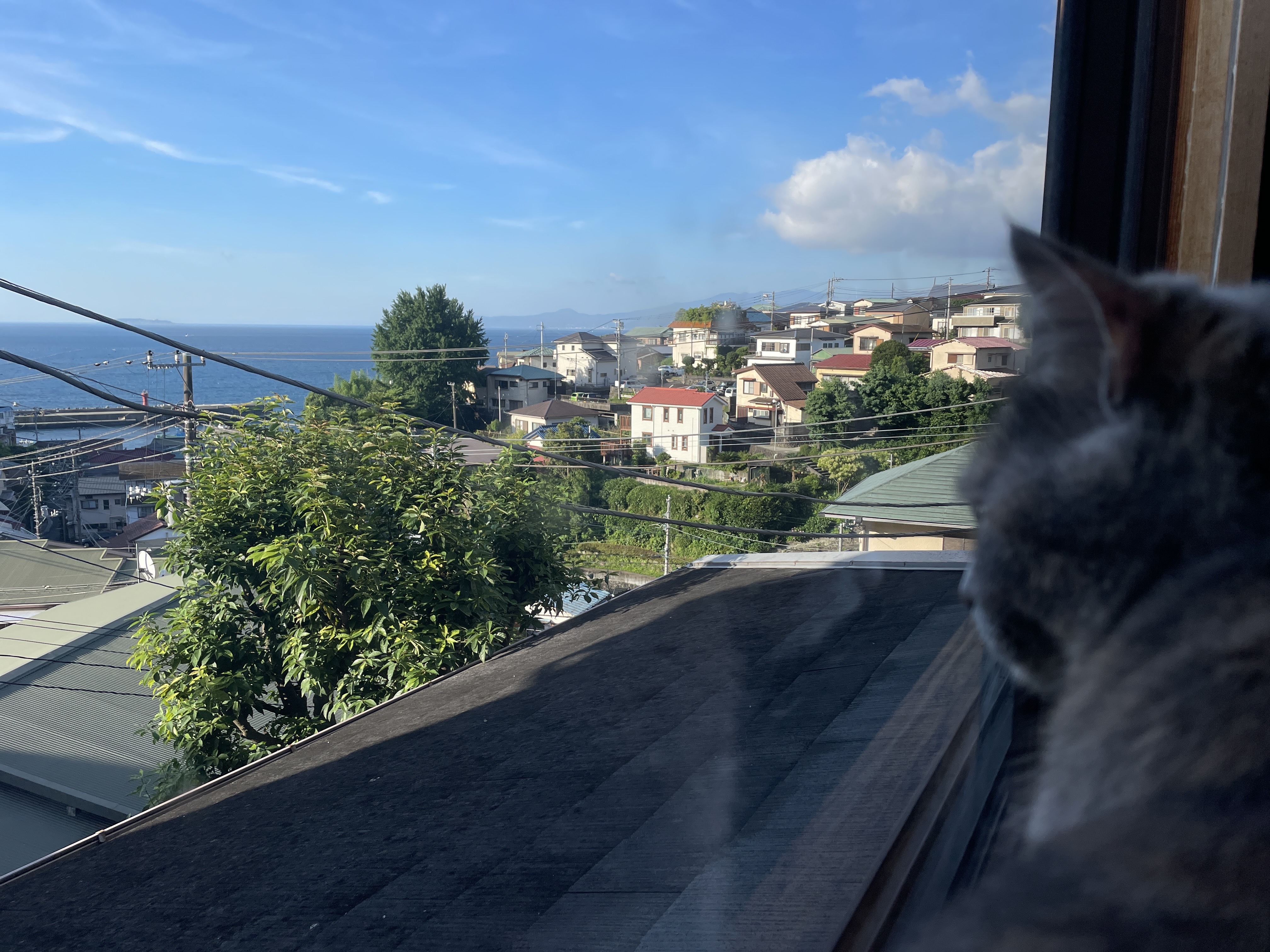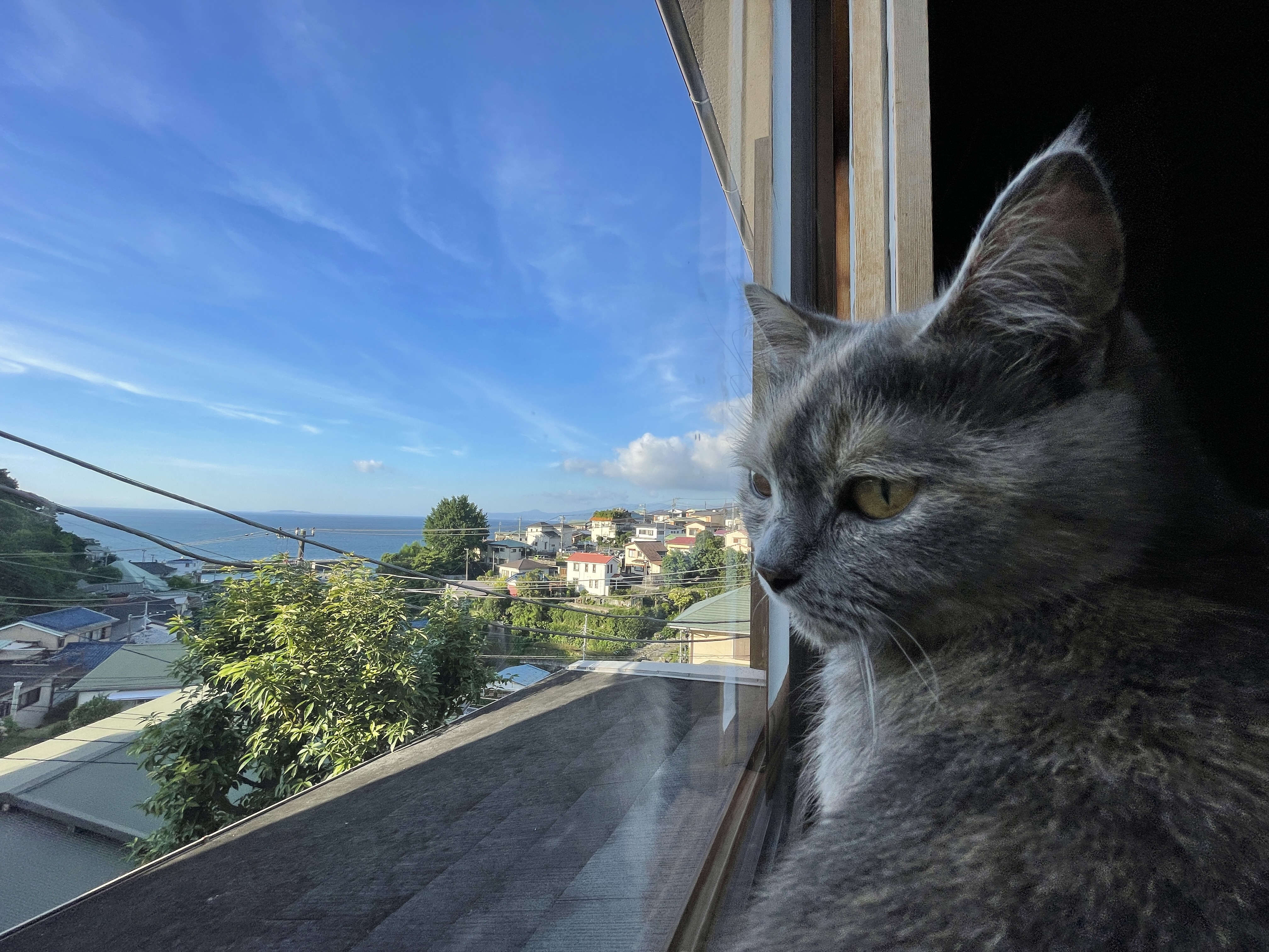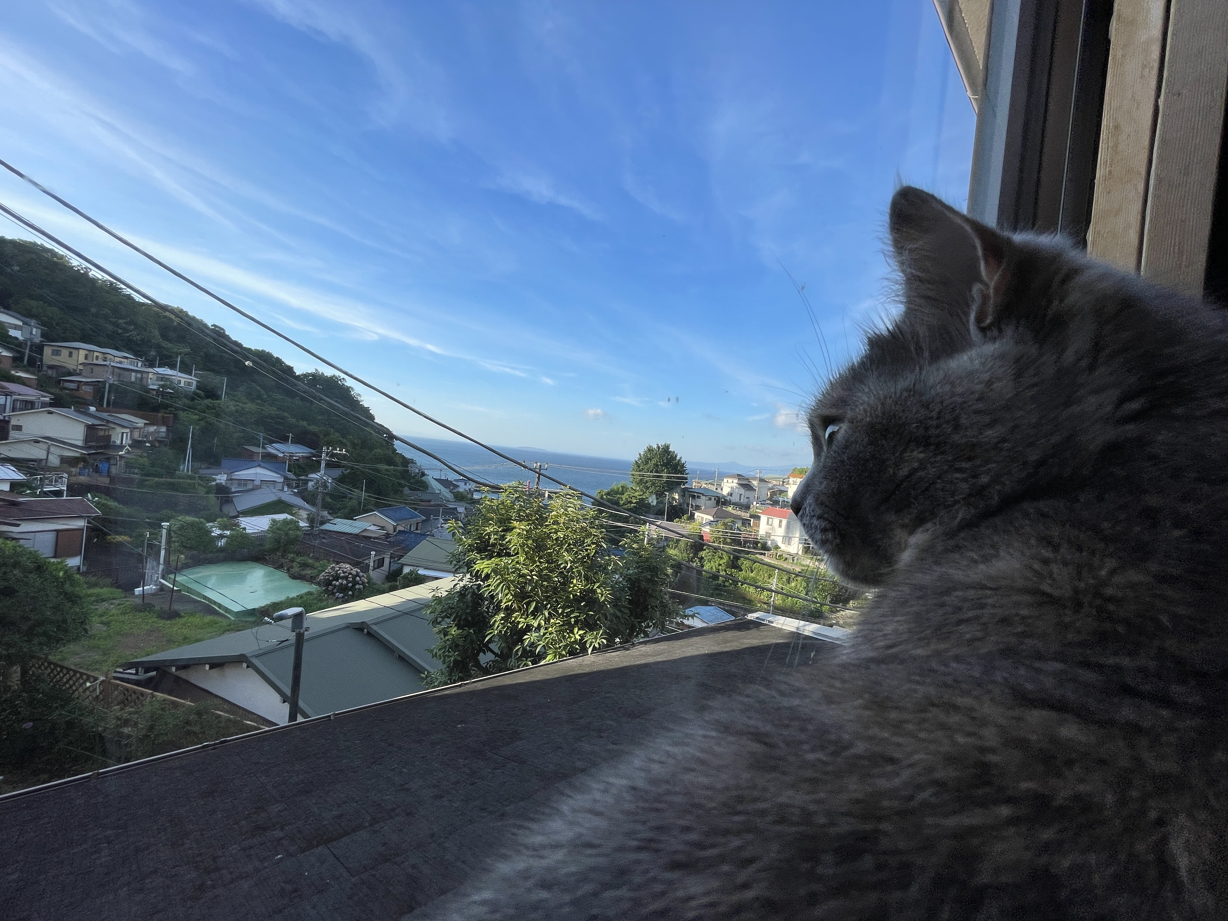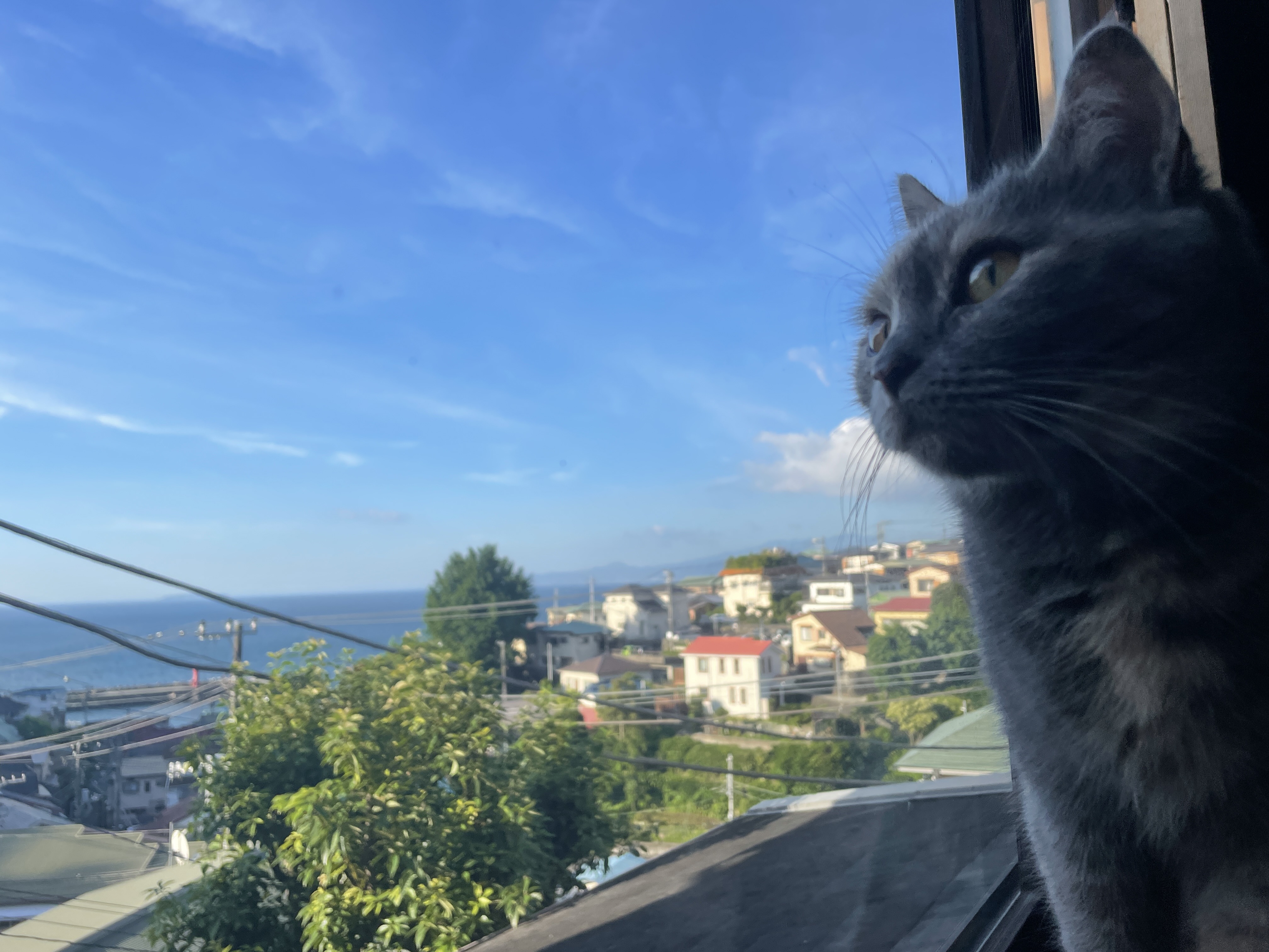 냥이와 묵을 수 있는 숙박에서 아침이 밝고 안쪽 덧문을 열어줬더니 바로 뷰 감상 하시는 낭만 고양이 요시노 님