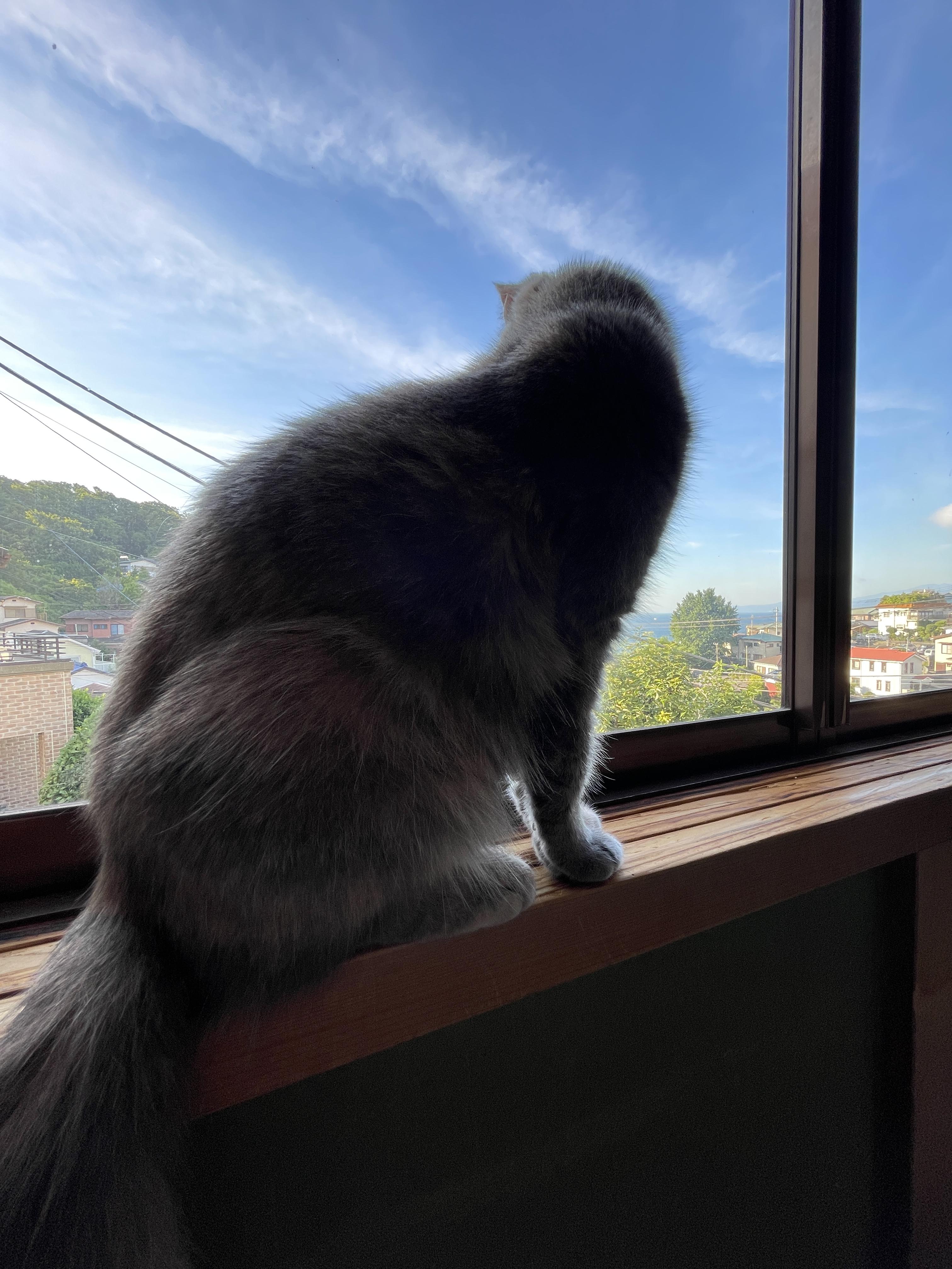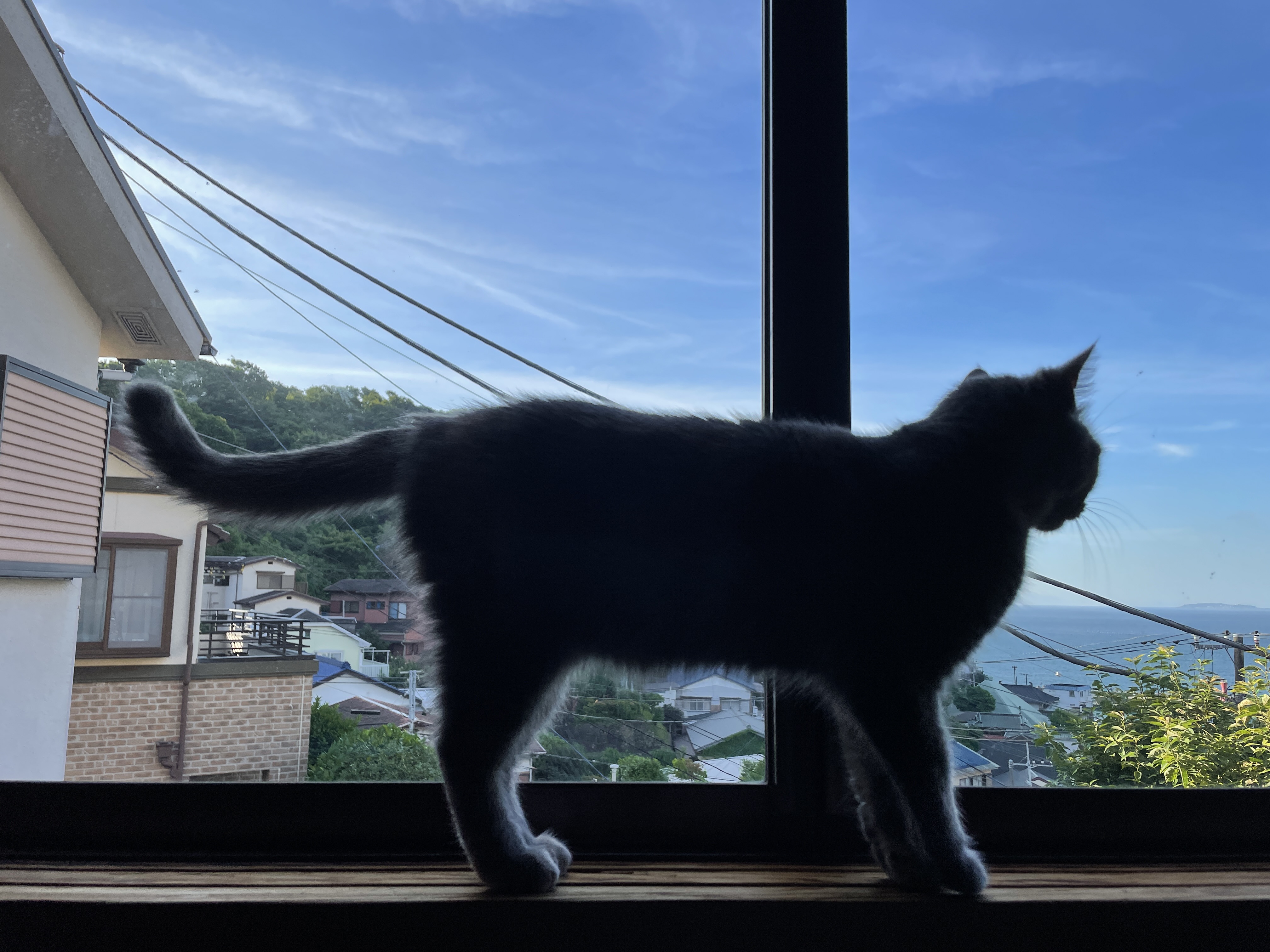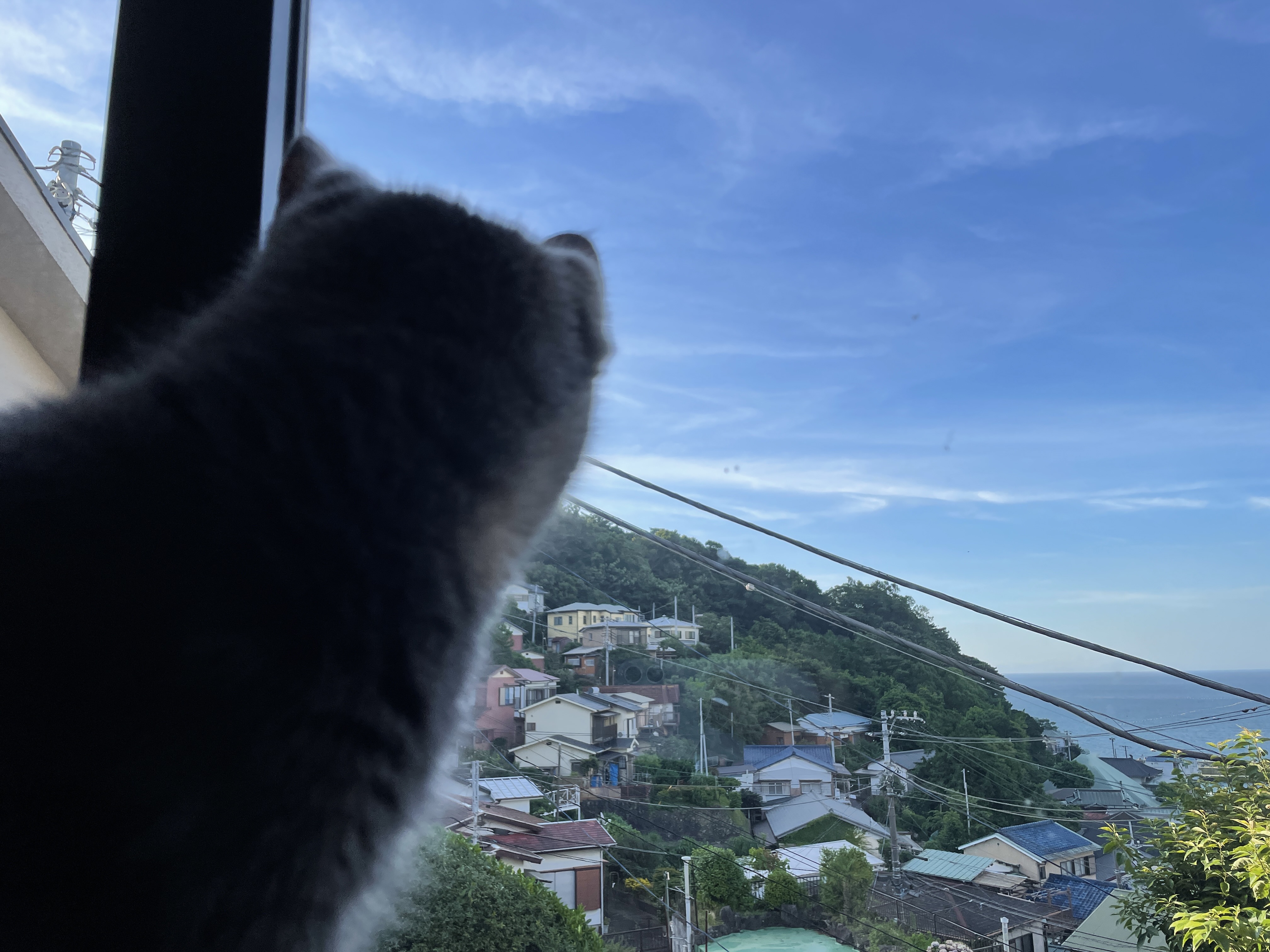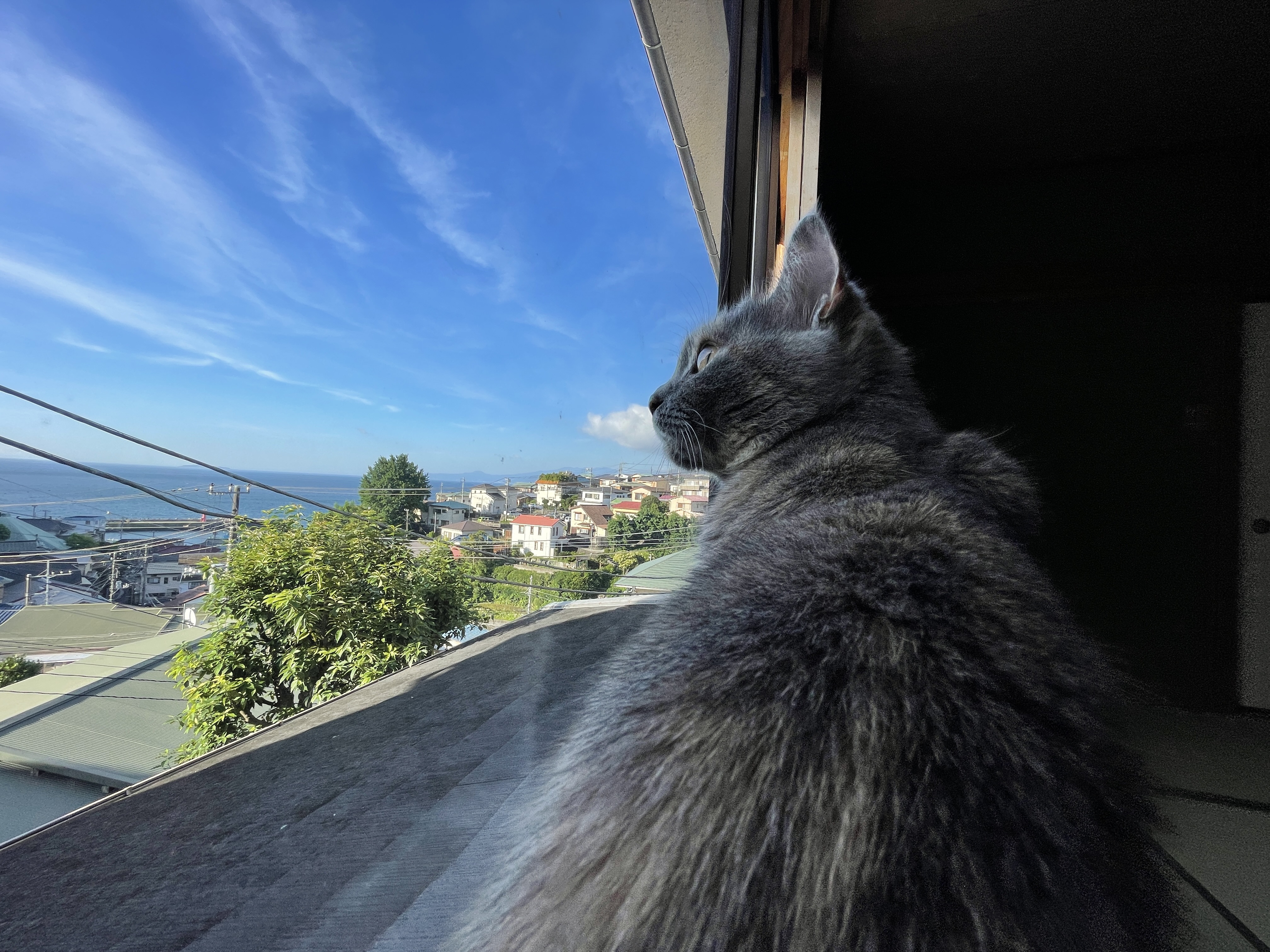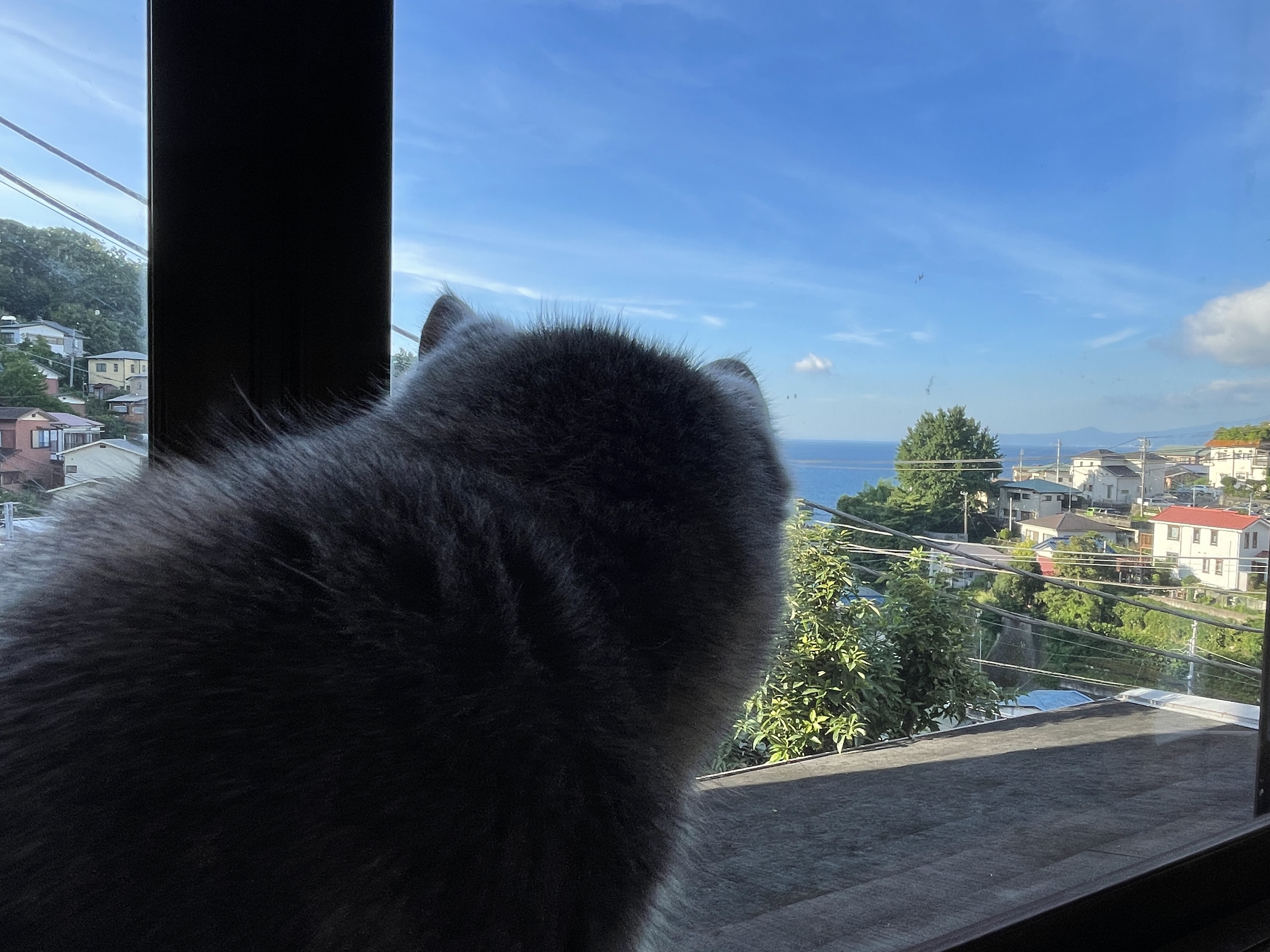 냥이와 묵을 수 있는 숙박에서 아침이 밝고 안쪽 덧문을 열어줬더니 바로 뷰 감상 하시는 낭만 고양이 요시노 님