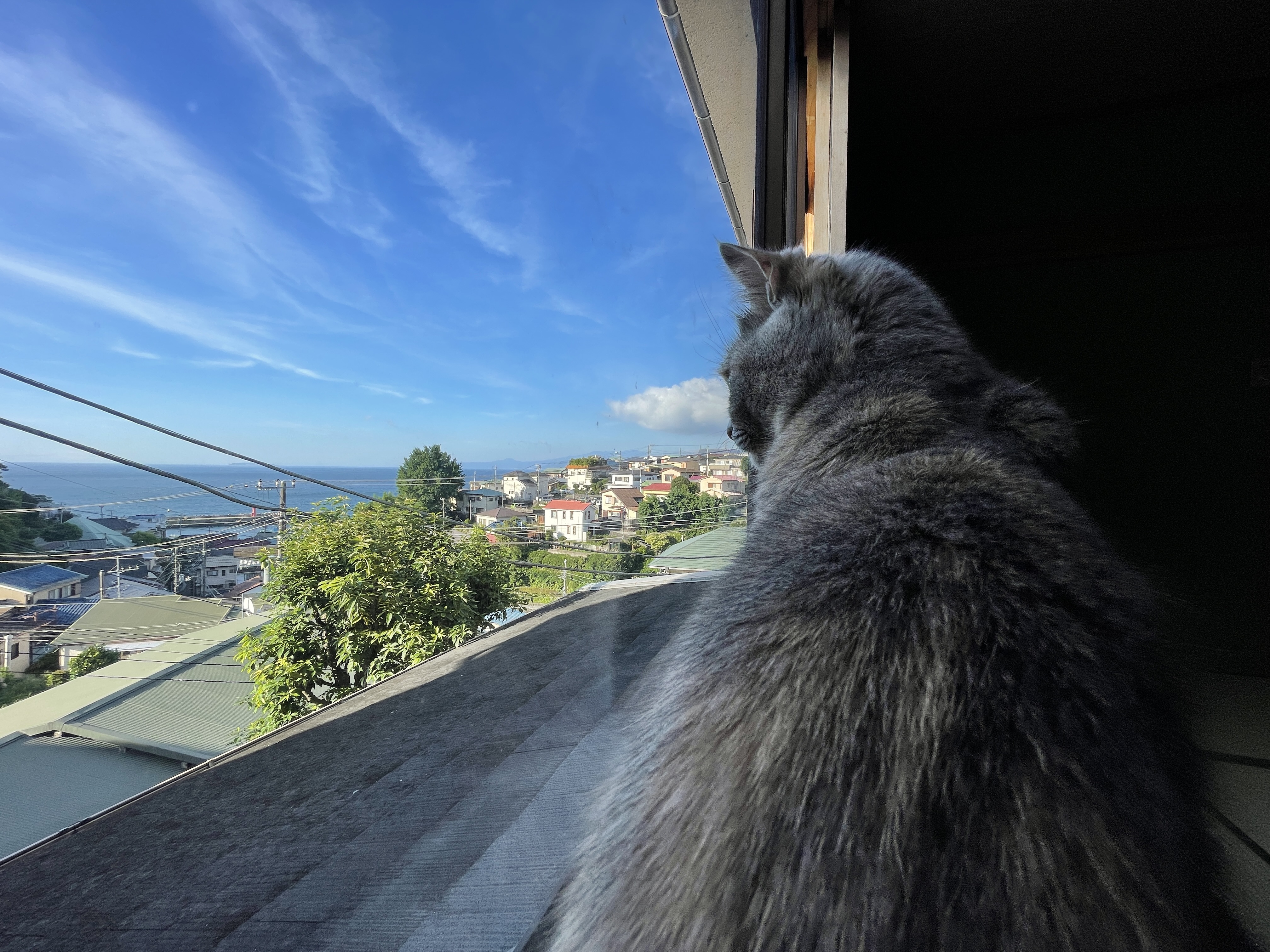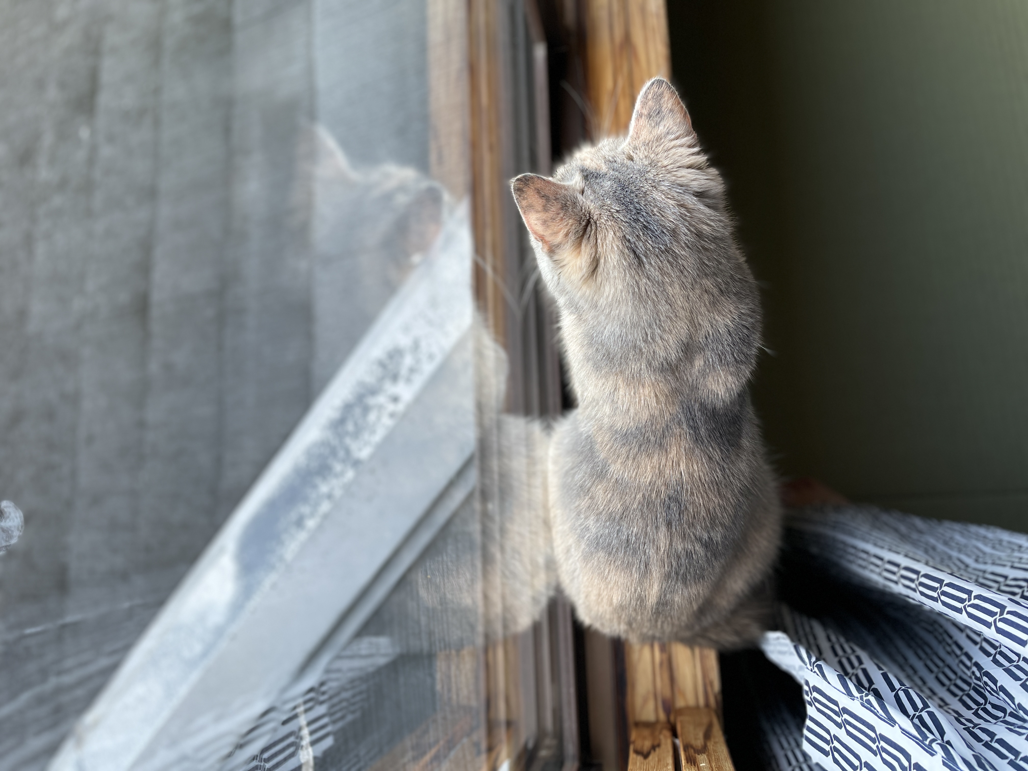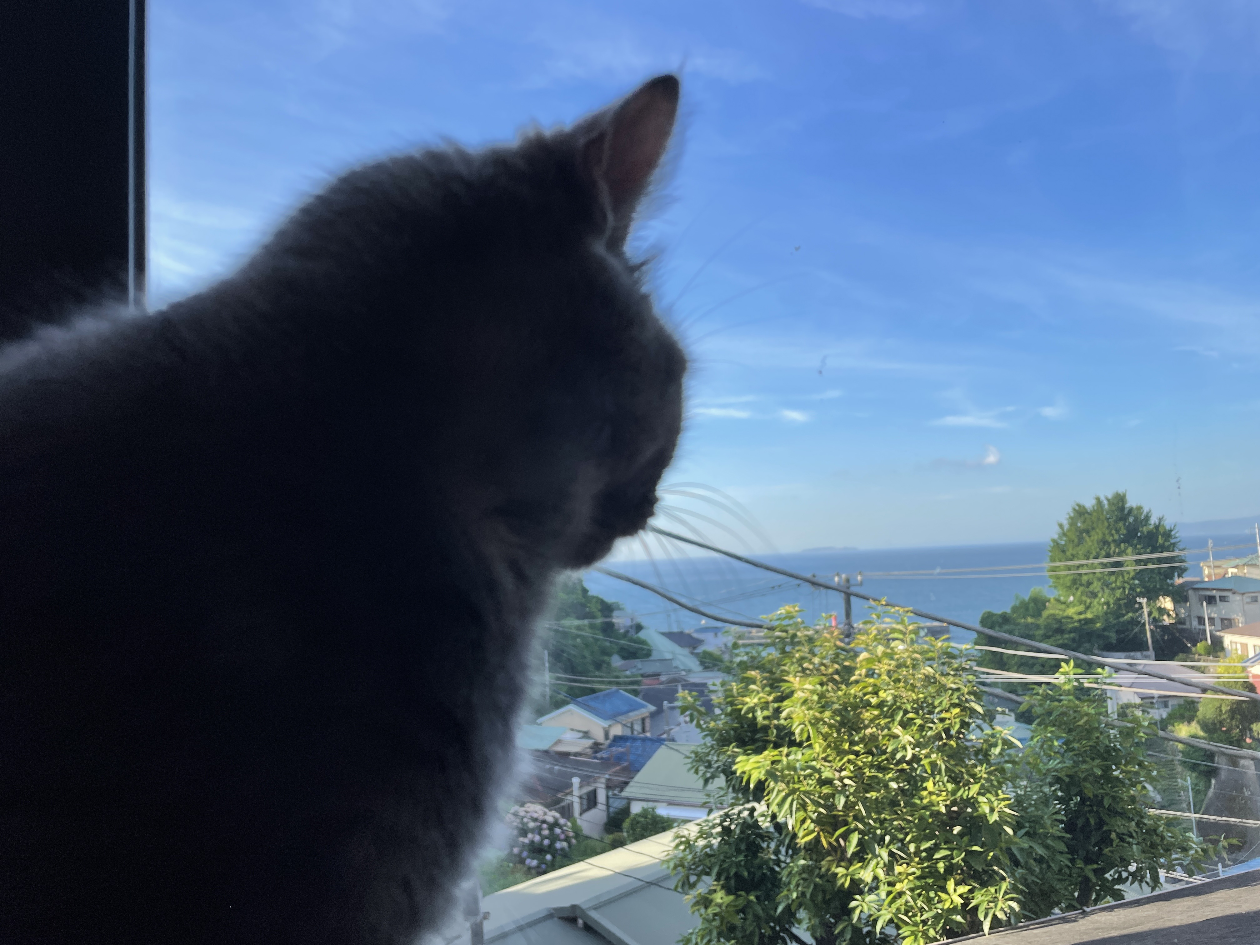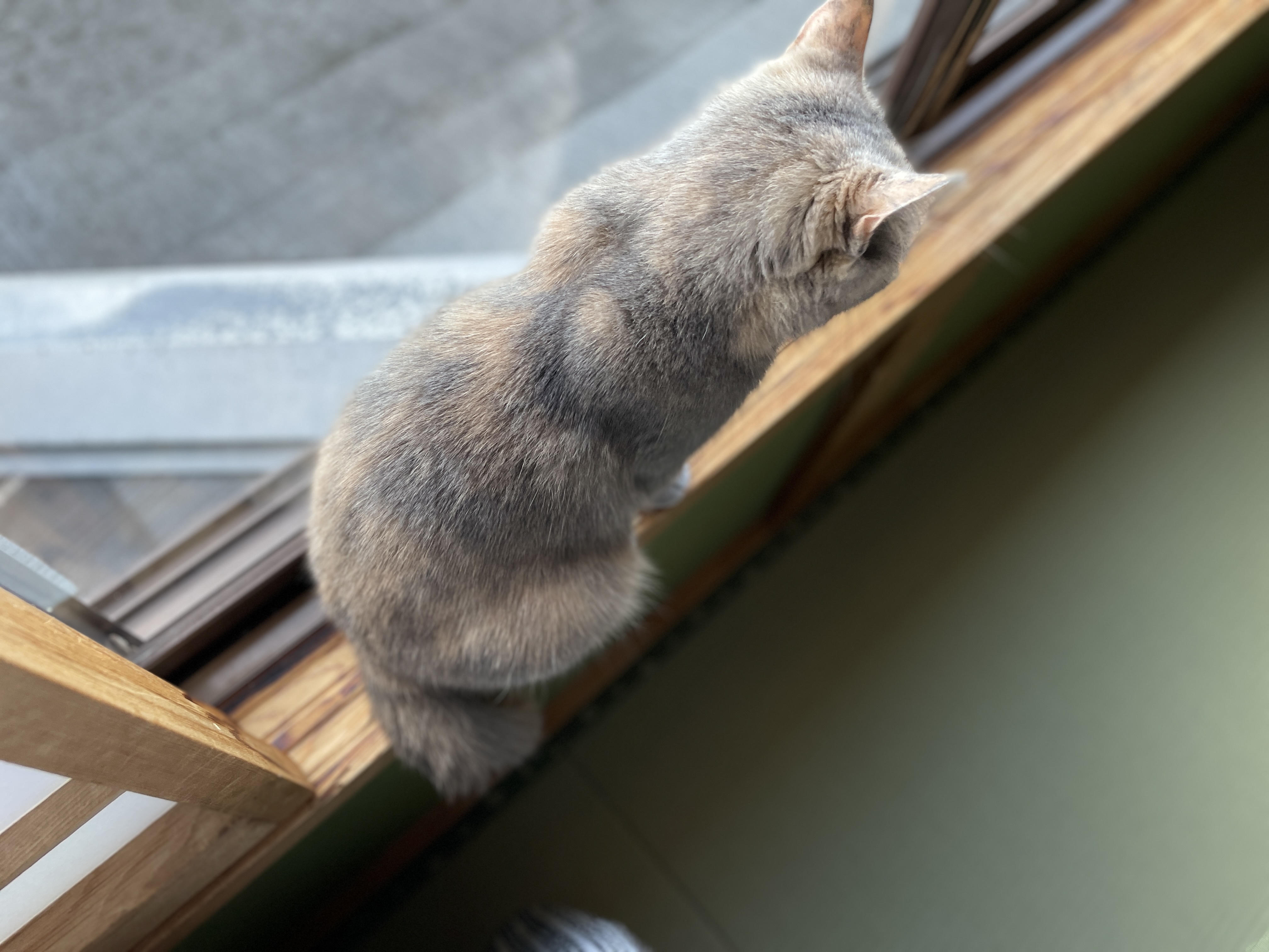 냥이와 묵을 수 있는 숙박에서 아침이 밝고 안쪽 덧문을 열어줬더니 바로 뷰 감상 하시는 낭만 고양이 요시노 님