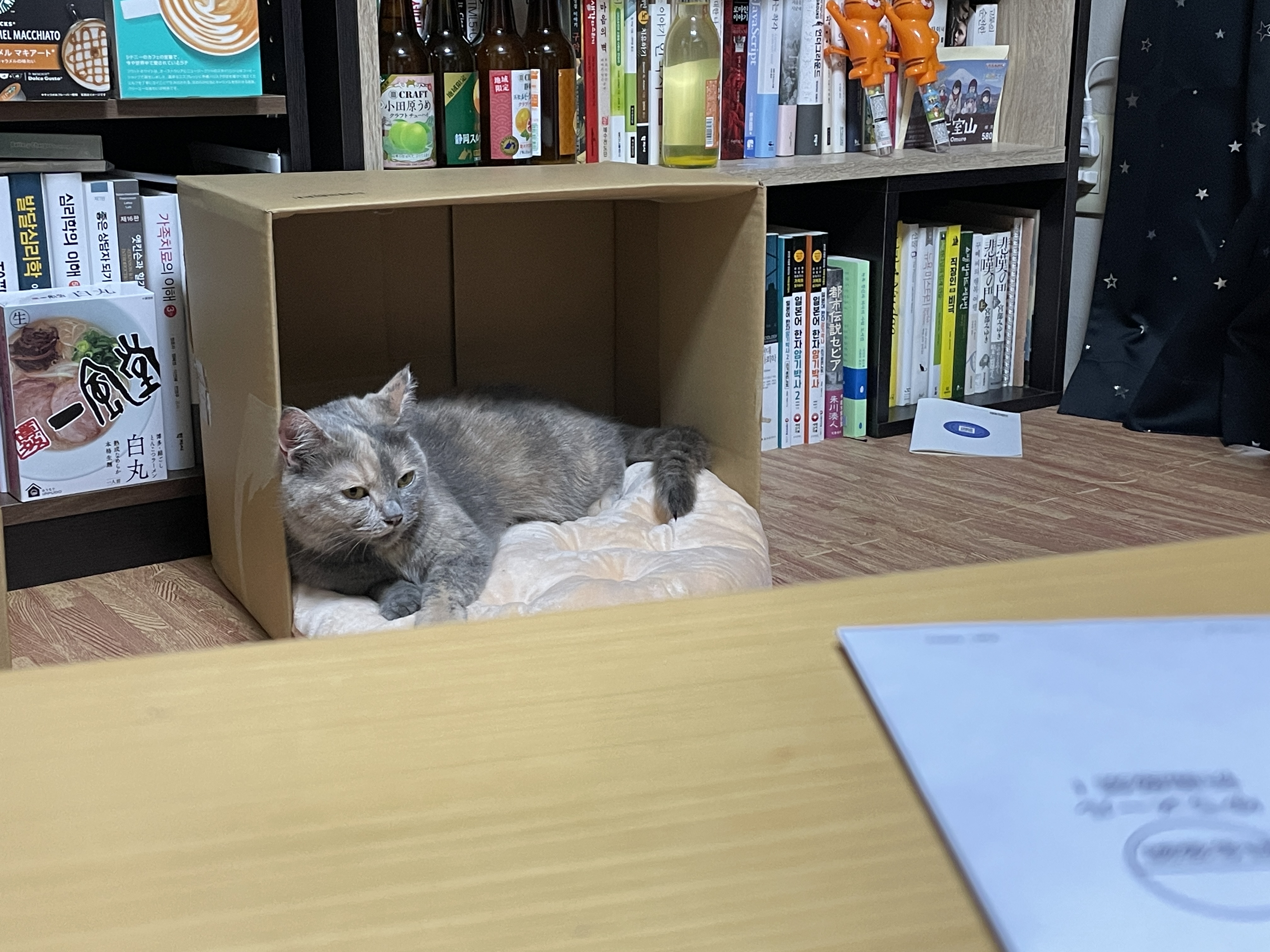현관에 드러누워 있길래 ㅋㅋ 박스 가져다 드렸는데 바닥에 계속 누움-
