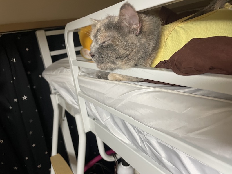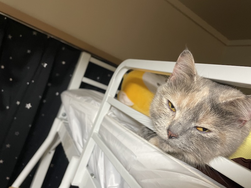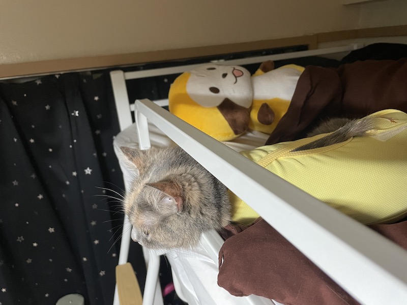 자세 바꿔서 얼굴 침대 봉? 에 걸치고 자는데 귀여워서 불 켬 ㅋㅋ