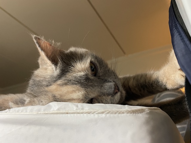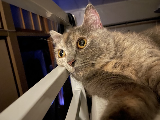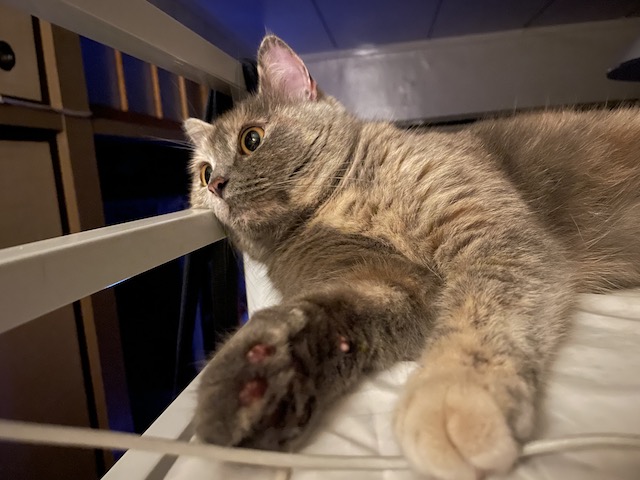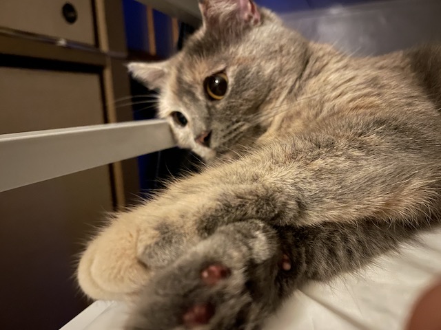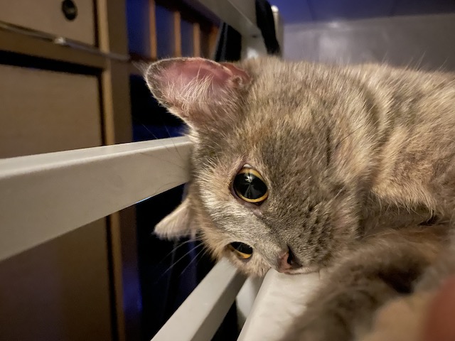 침대 프레임에 얼굴 걸친 율무가 귀여워서 카메라 켰더니 얼굴 돌리심