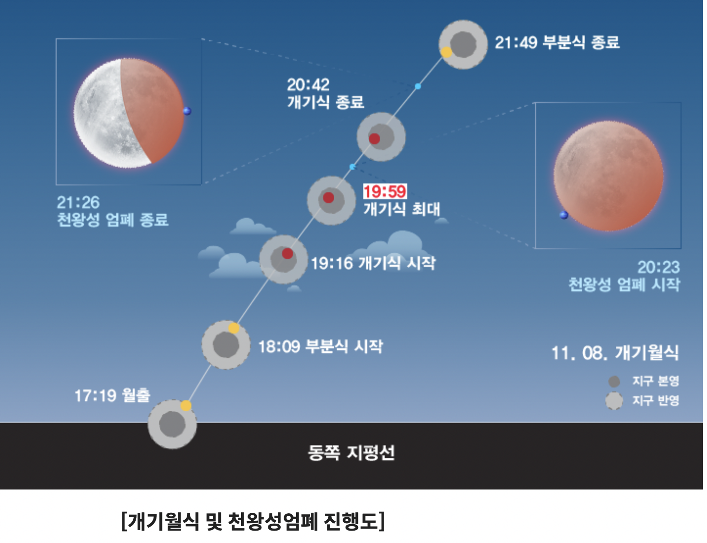 개기월식은 19시 16분에서 20시 42분까지로 1시간 반, 전역에서 관찰 가능!