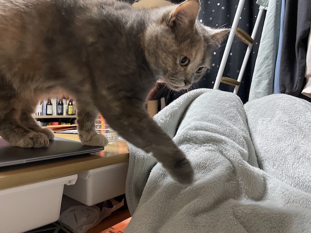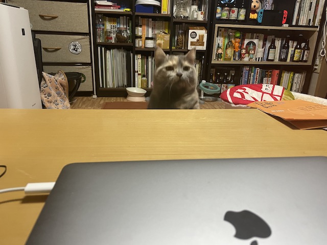 바로 집사가 앉아있는 쪽으로 오지 않고 테이블과 맥북을 즈려밟고 오는