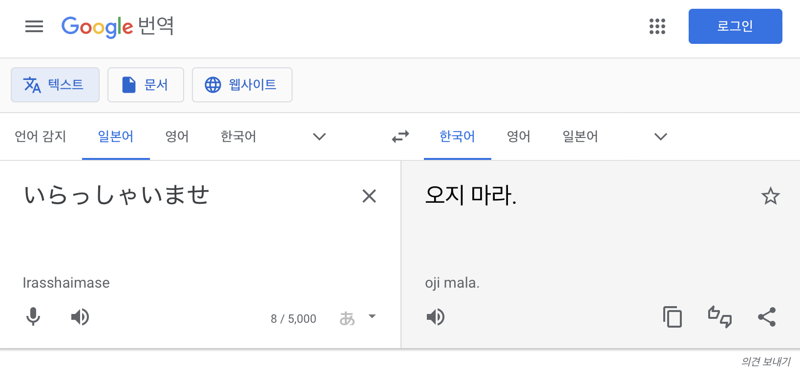 いらっしゃいませ(이랏샤이마세=어서오세요)가 오지마라 라고 번역된걸 보고 ..