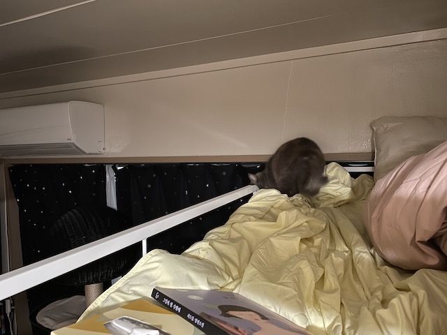 먼저 캣타워에 올라가 침대 올라갈 준비를 합니다.