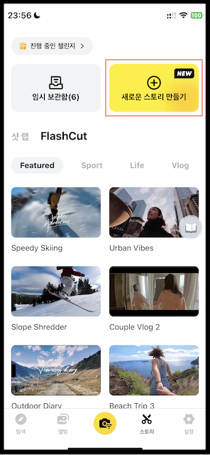 하단에 스토리 버튼 누르고 들어가면 새로운 스토리 만들기가 있습니다.