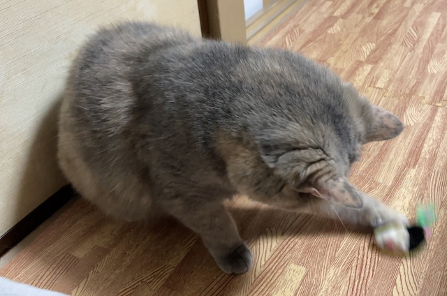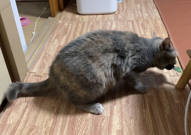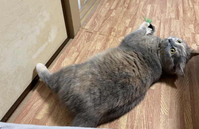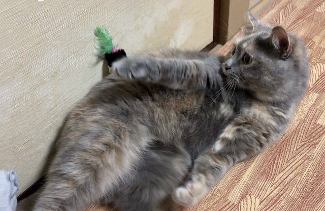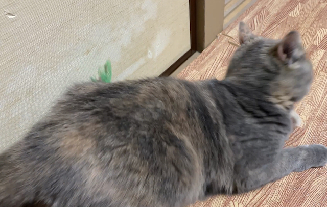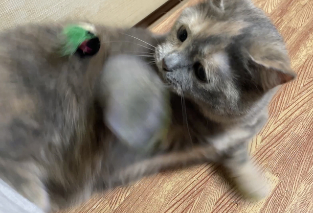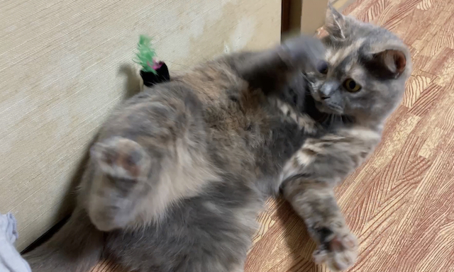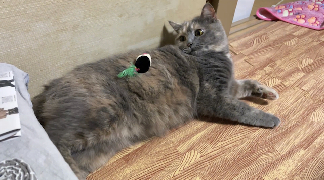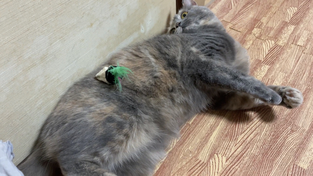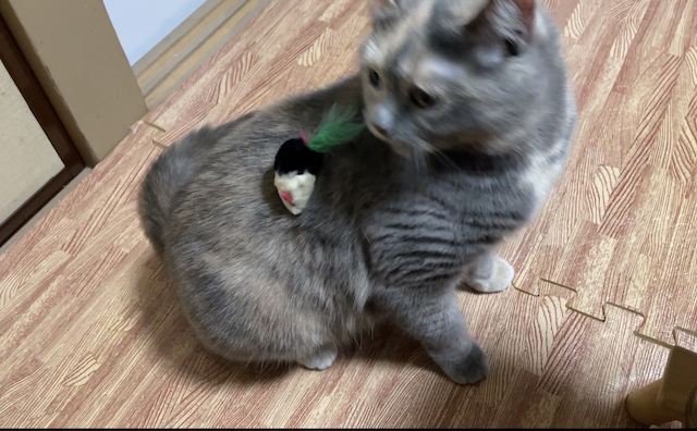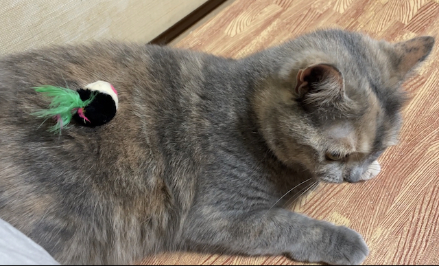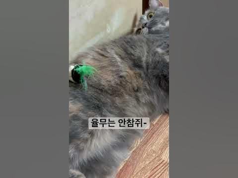 누워 쉬는 율무 위에 쥐돌이를 올려 보았습니다.