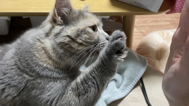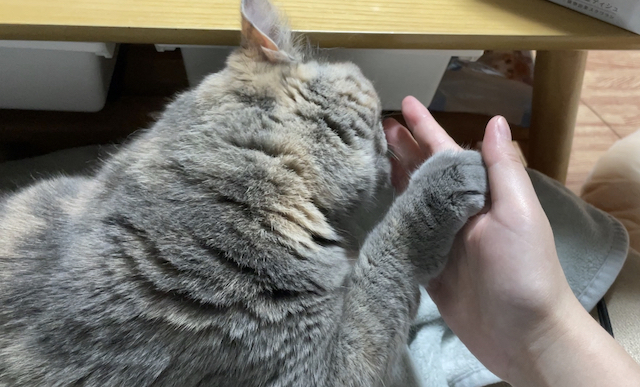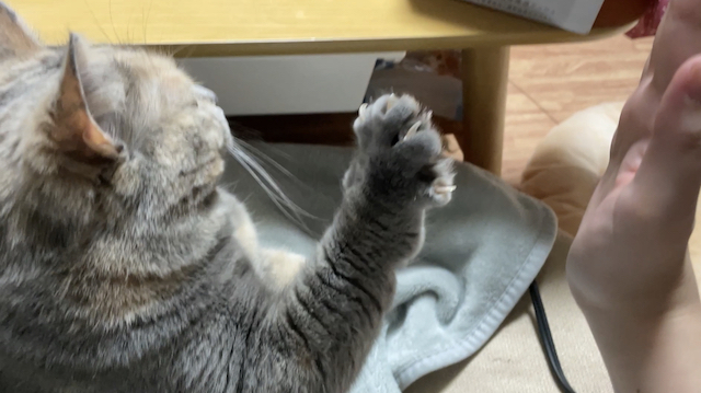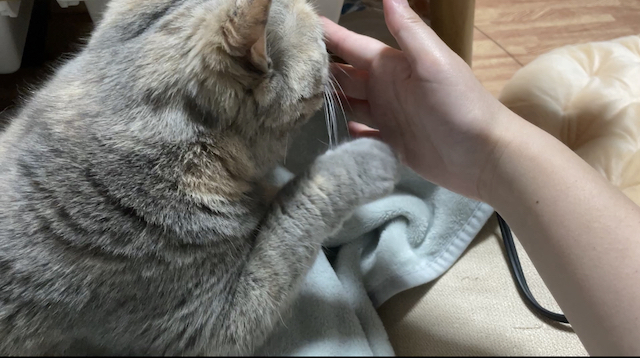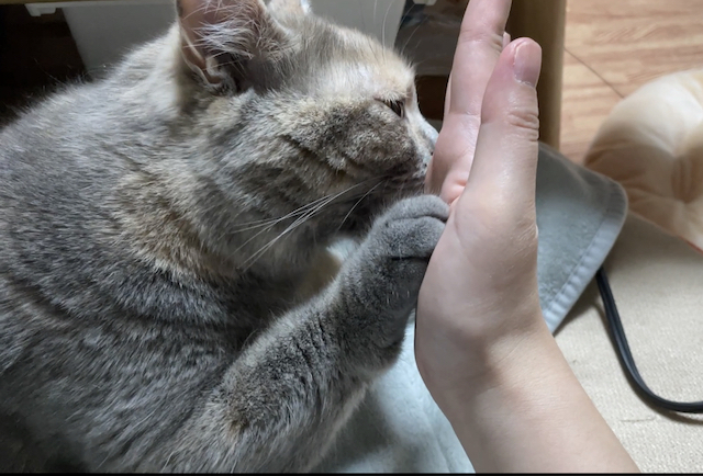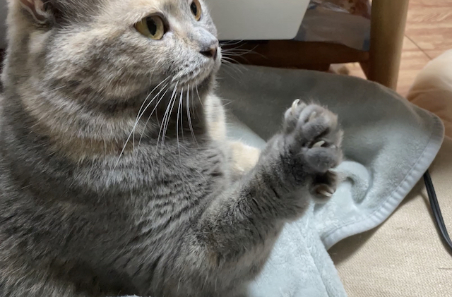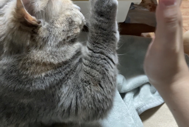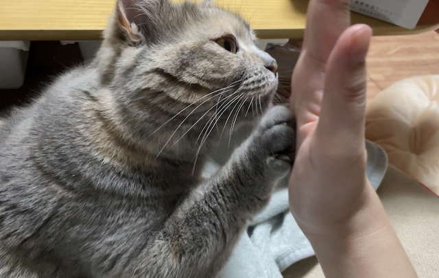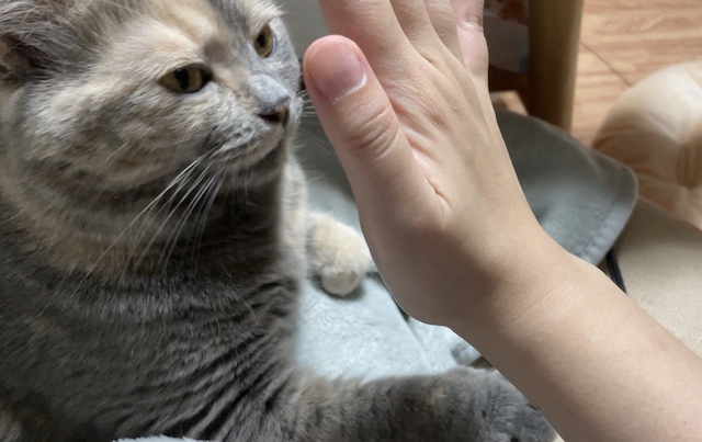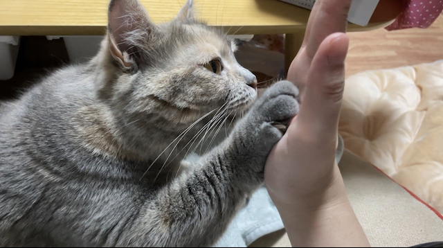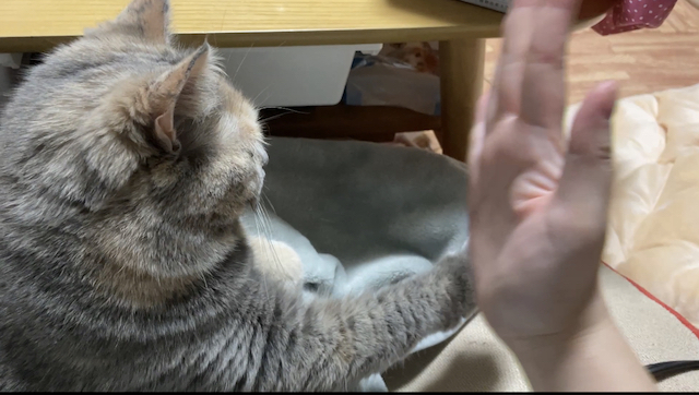 방법 : 율무가 손을 쭈욱 뻗어서 집사를 부를 때 타이밍 좋게 하이파이브를 한다.