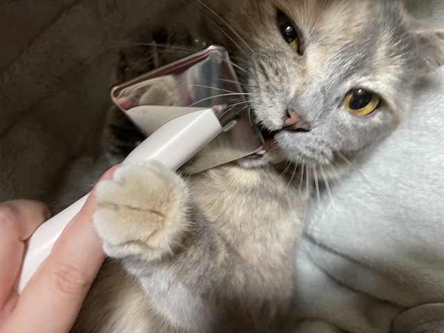빗으로 배 부분 빗질을 하면 율무는 맹수가 됩니다.