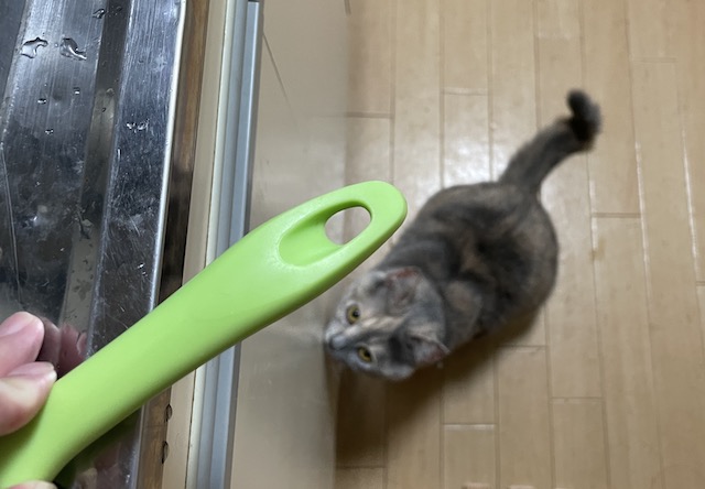 이렇게 올려놓은 뒤집개를 발견한 율무가
