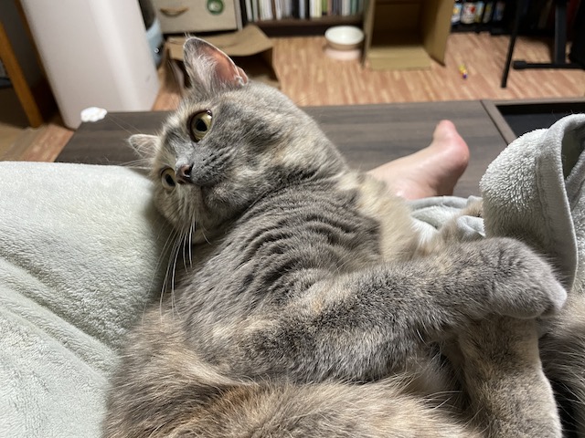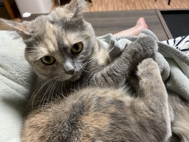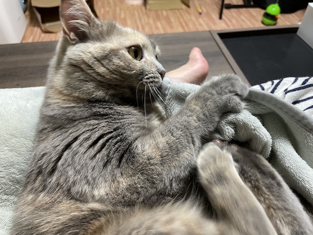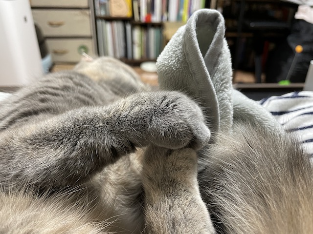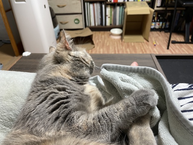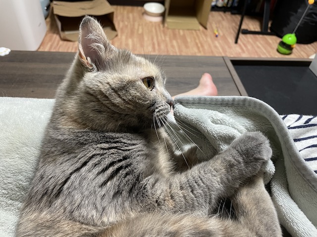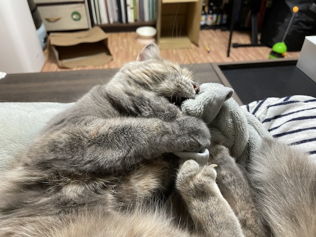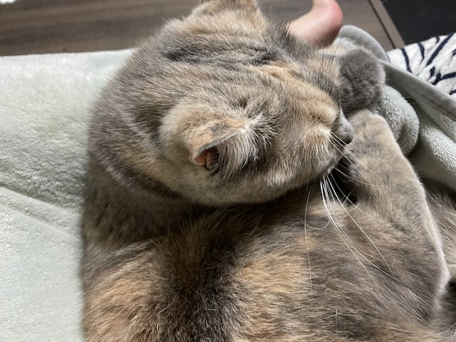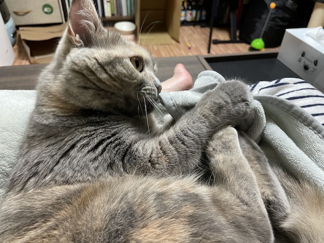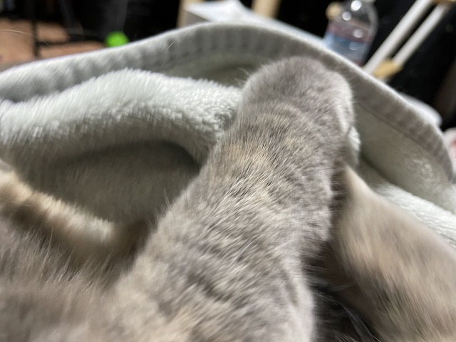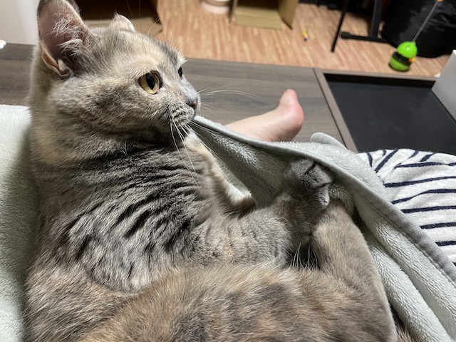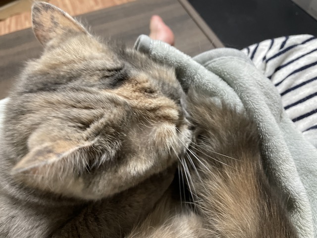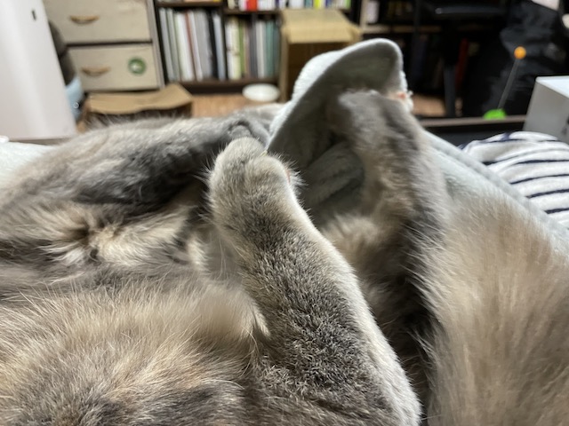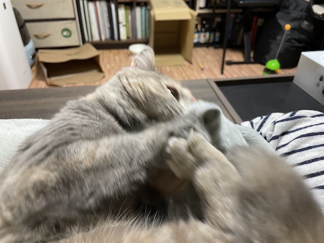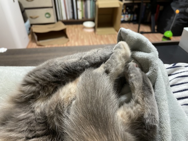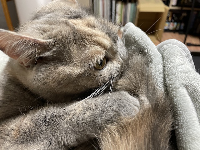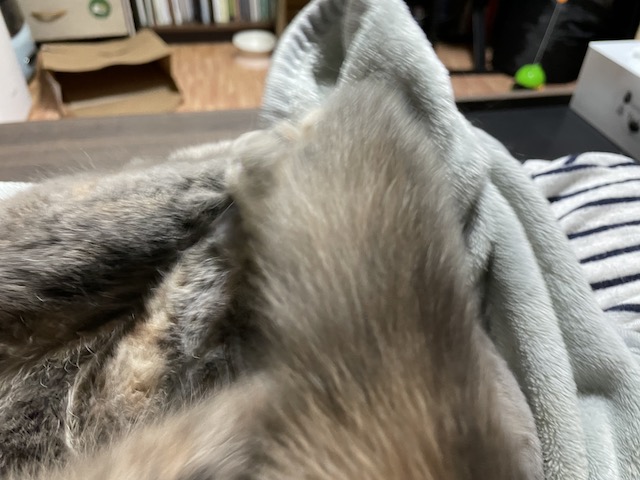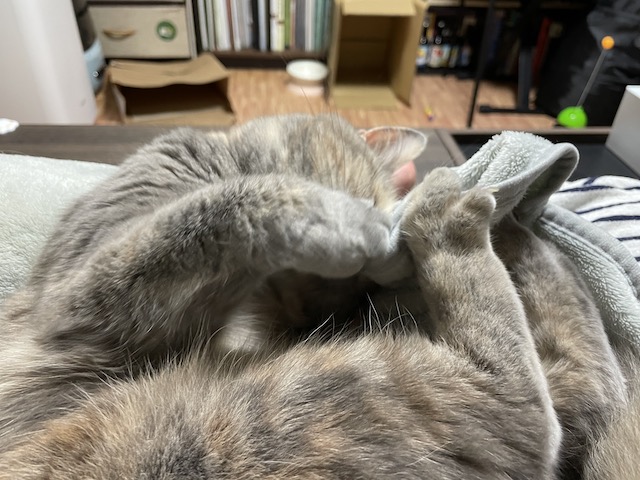꼬리도 이불도 부여잡고 꼬리 그루밍을 한참 했다 합니다.
