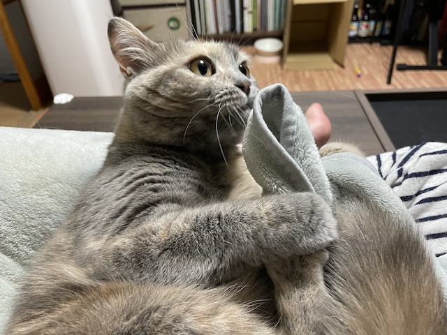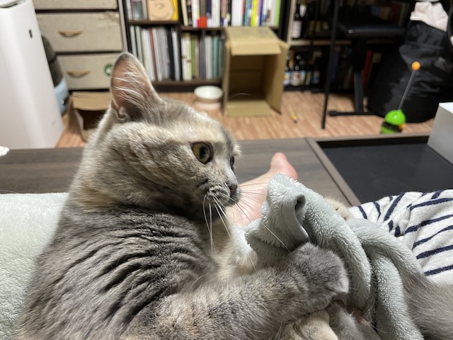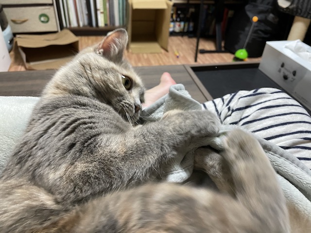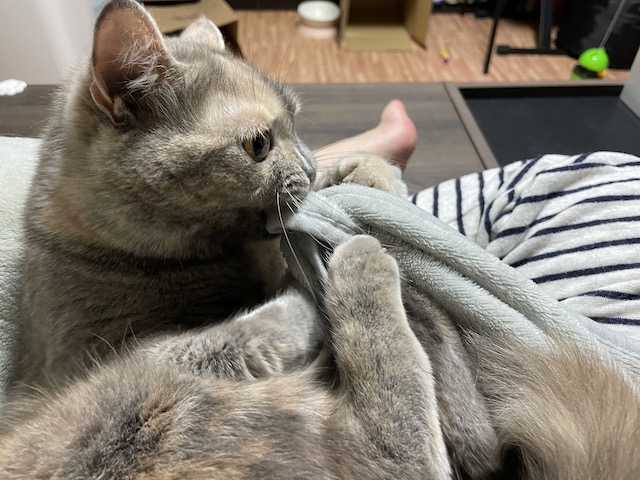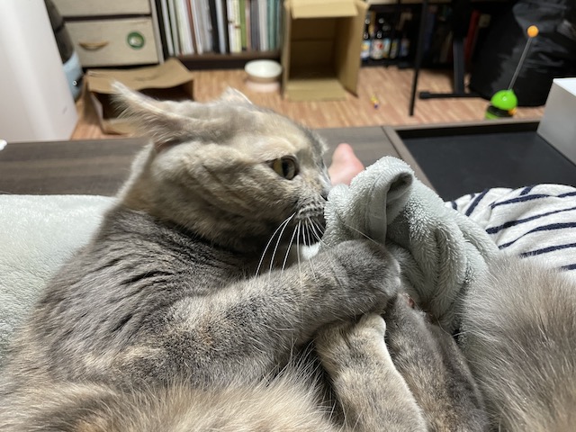 이불 야무지게 잡고 물어뜯는 중