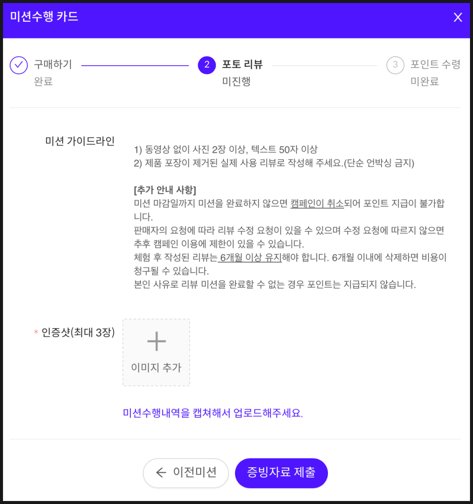 구매 후 구매 인증(+ 추가 미션이 있는 경우 미션 수행 인증),