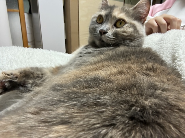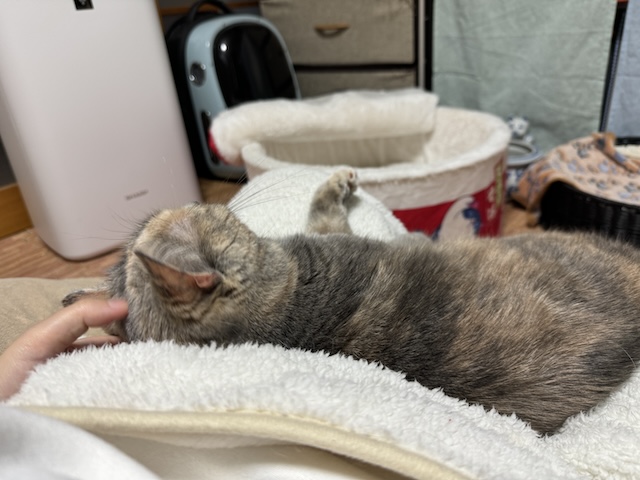 집사가 드러누우면서 율무 침대(집사 다리)가 올라가는 중