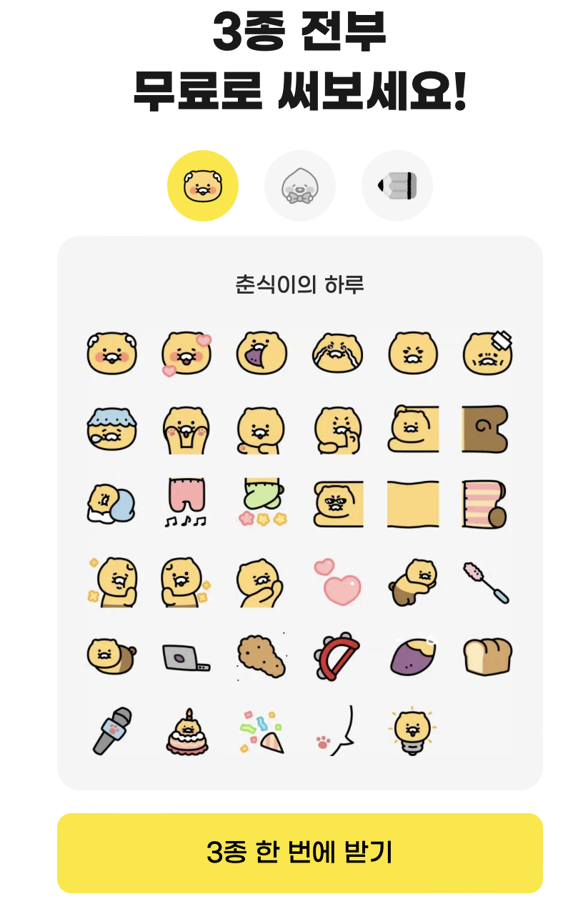 우악 ㅋㅋ 카카오에서 3종 무료 미니 이모티콘을 뿌리고 있습니다 ㅎㅎㅎㅎ