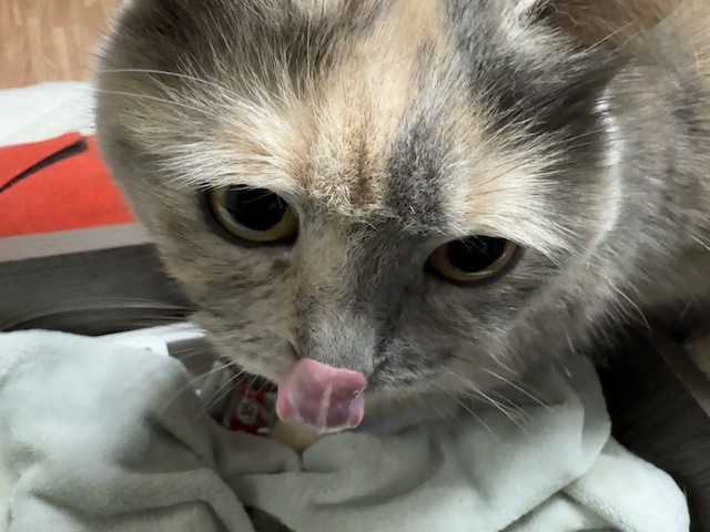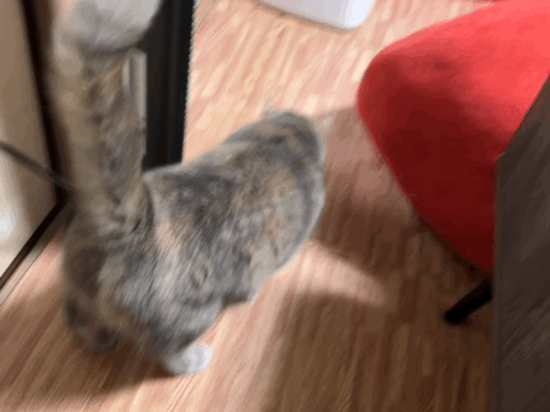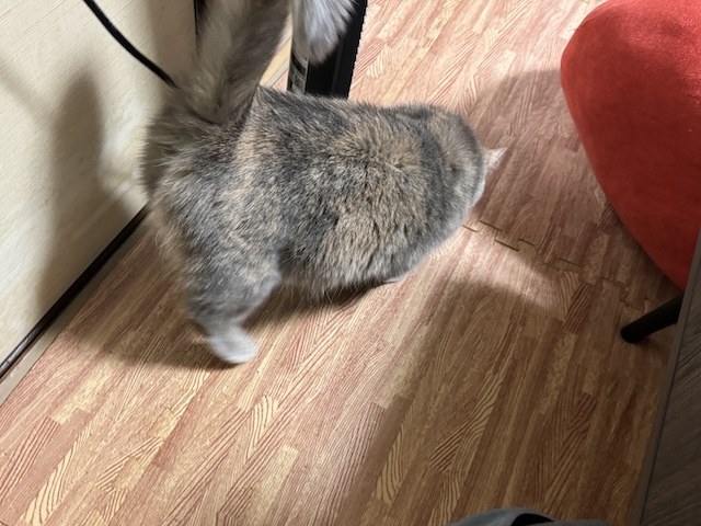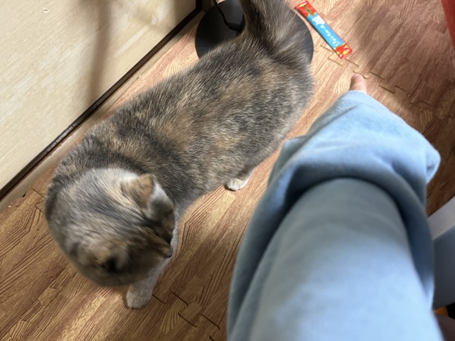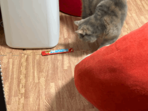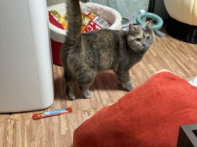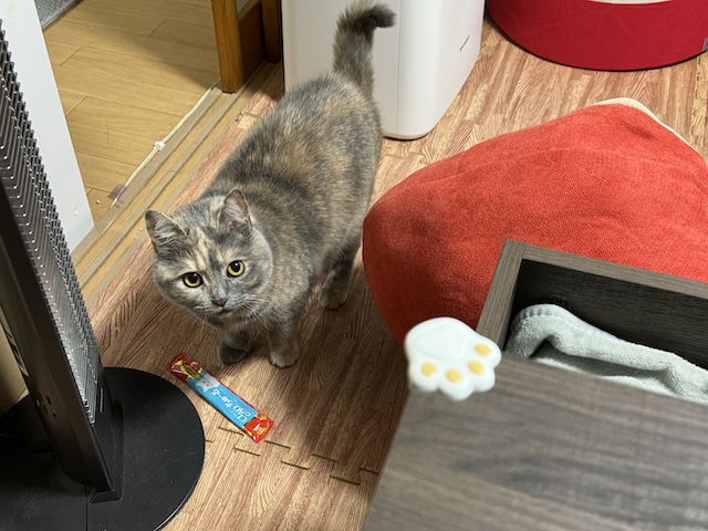 테이블 밑에 들어가서 담뇨를 벅벅 긁던 율무는 츄르를 꺼내는데 성공을 했습니다.