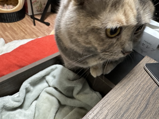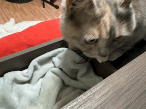 테이블 밑에 요런 수납장에 츄르를 넣어두고 담뇨를 덮어놨었는데 ㅎㅎㅎ