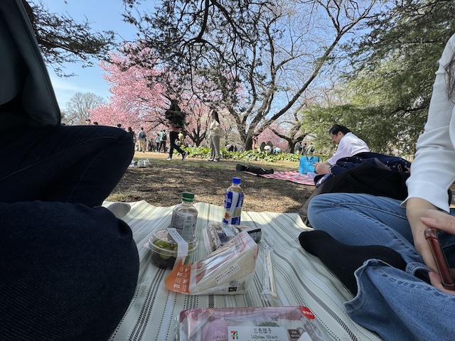 신주쿠 교엔 들어와서 돗자리 깔고 일단 먹기 ㅋㅋ