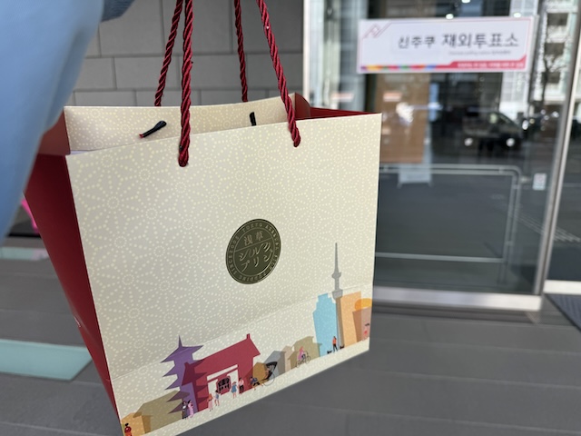 전날 산 푸딩을 들고 신주쿠 재외 투표소 고고