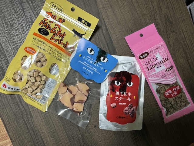 율무가 좋아하는 간식이랑, 가쯔오 스테이크, 와규 스테이크, 데코용으로 쓸라고 산 귀엽게 생긴 간식