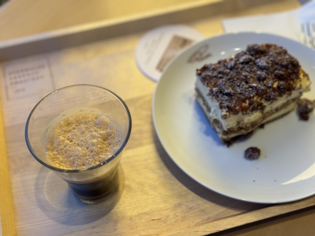 제가 시킨 커피랑 케익! 티라미스 위에 쿠키 같은거인가 뭐 올라갔는데