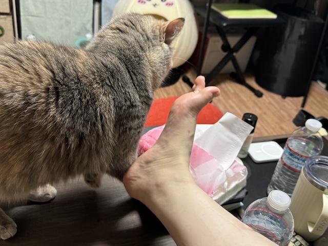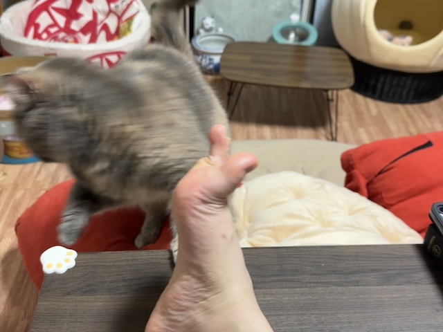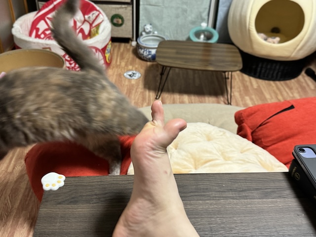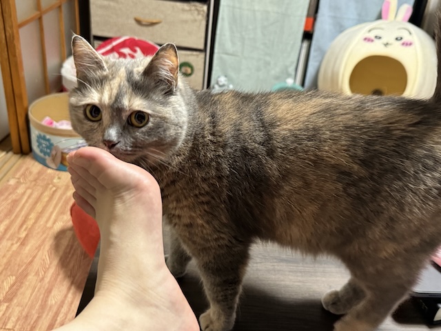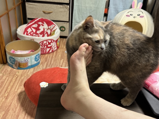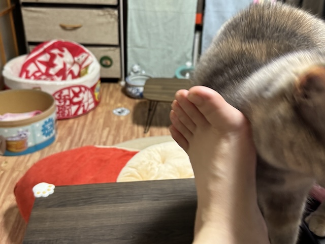 다시온 율무. 아까 반응이 머쓱하지만 옷겨서 발 들이대는 중