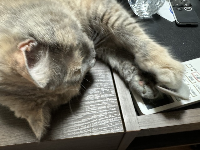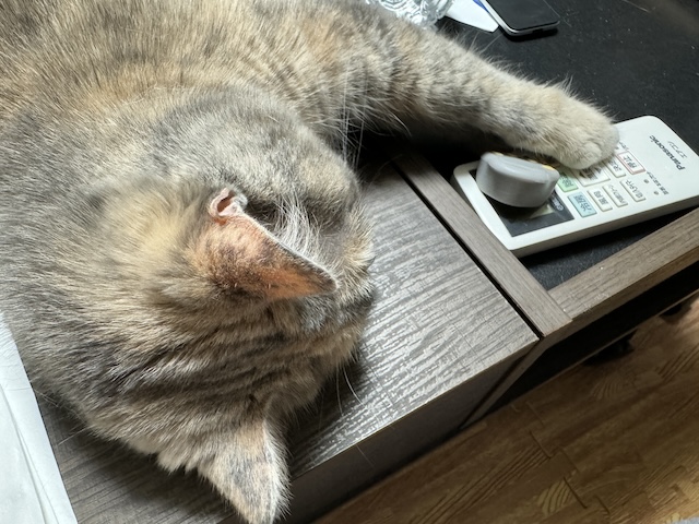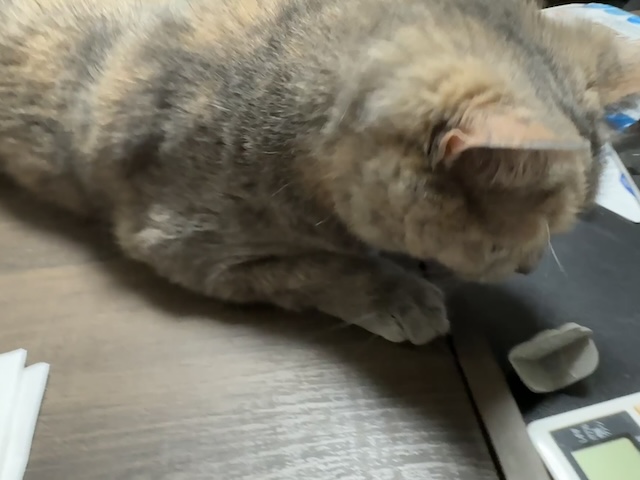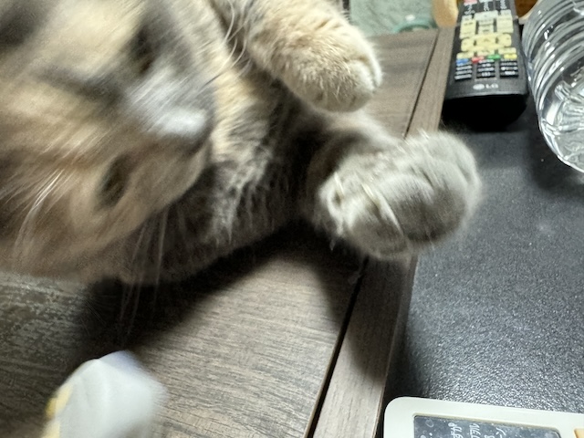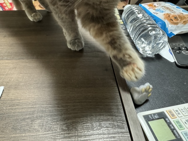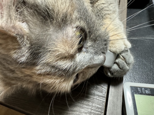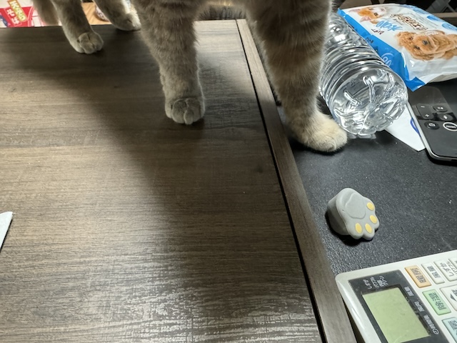 집사 밥 다 먹으니 테이블에 드러누워 있길래 모서리 보호 캡을 근처에 둬 봤습니다.