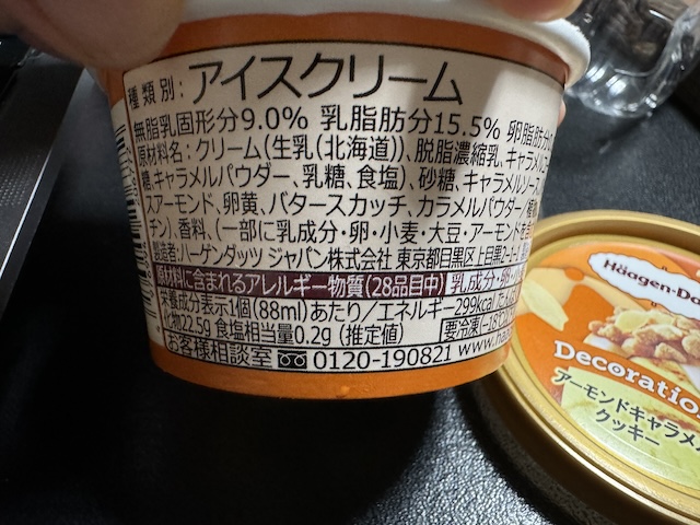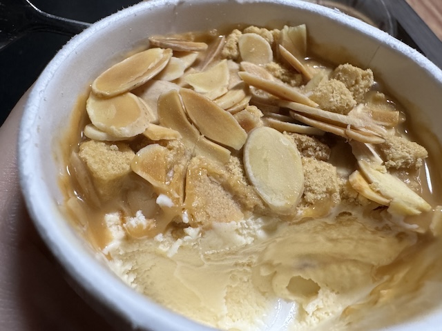아이스크림 위에 캬라멜이 깔려 있고, 그 위에 쿠키랑 아몬드가 올라가 있네요!