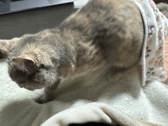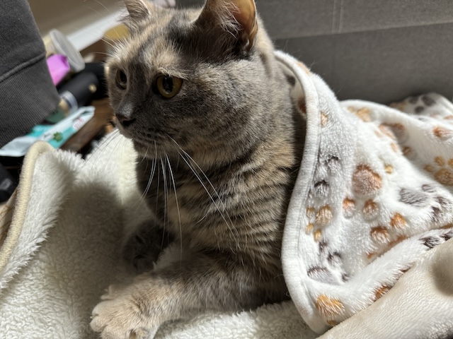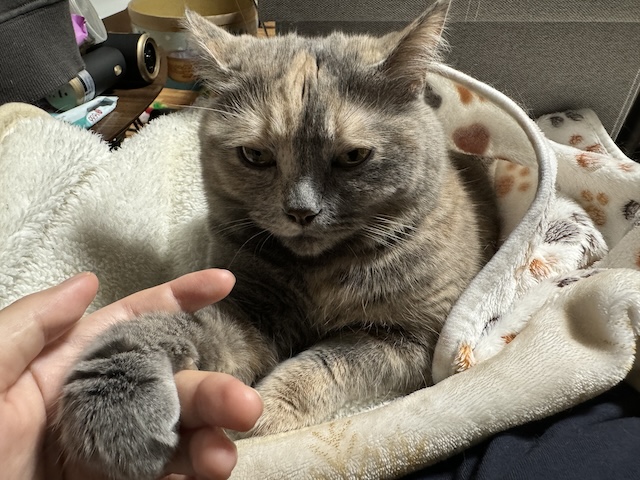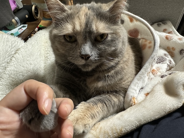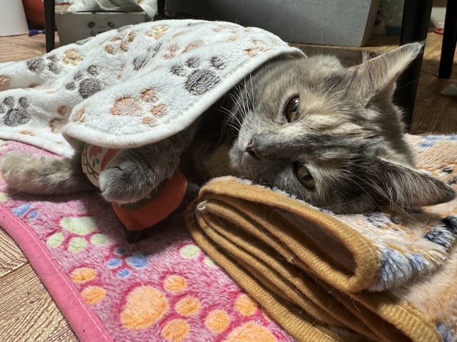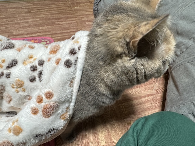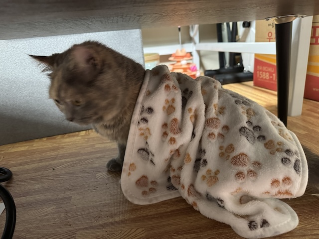 그대로 이불 걸치고 집사 무릎에 올라오심
