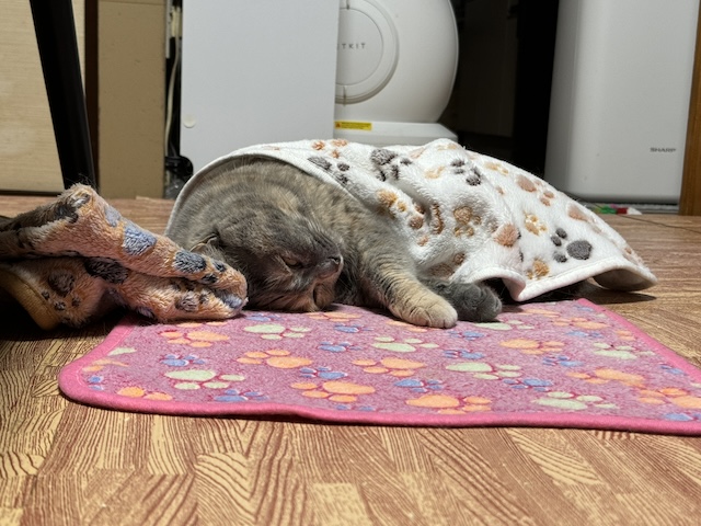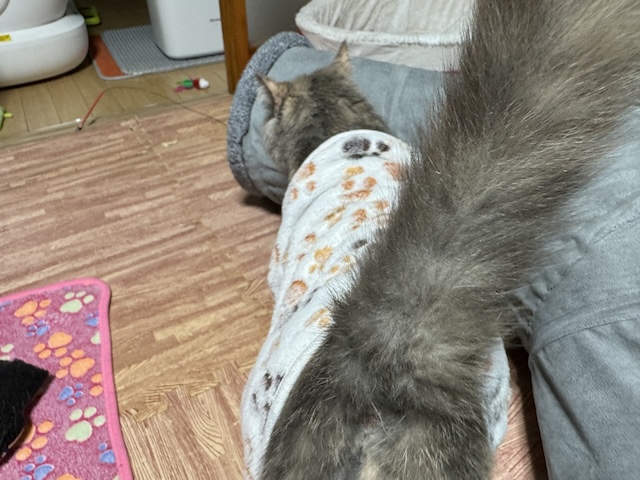 핑크 담뇨 위에서 자고 있길래 나머지 이불로 덮어주고 베개를 만들어 주고