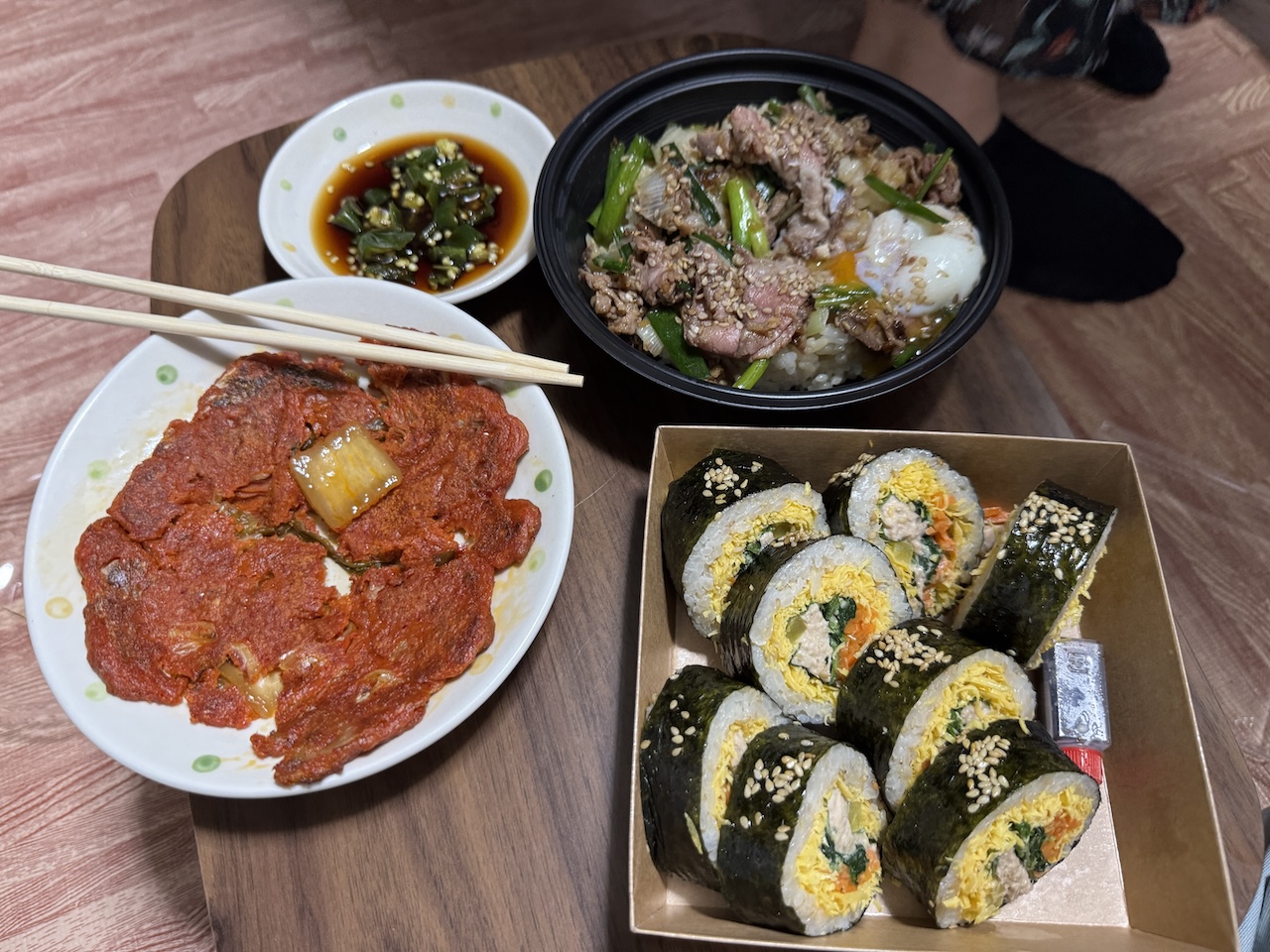 오는길에 김밥 배달 시키고 고기 덮밥 사오신 친구님
