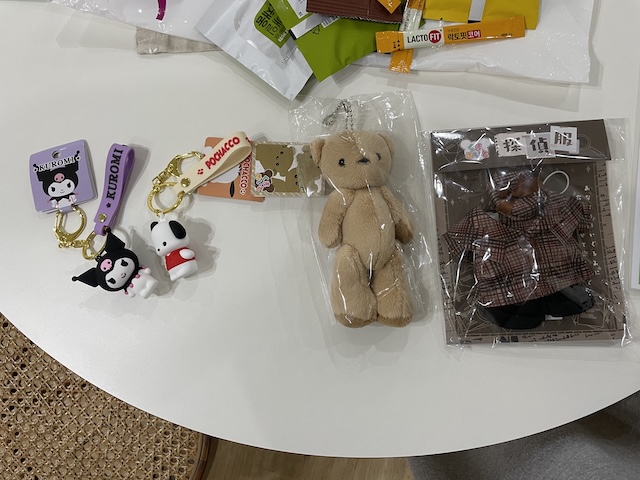 공항에서 산 기념품과 전에 영화관에 갔다가 산 친구 줄 인형.