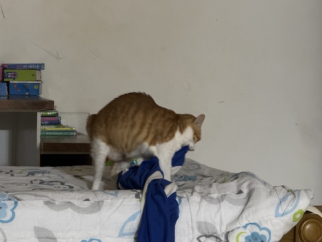 그리고 랜선집사가 입을라고 꺼내놓은 츄리닝에 꾹꾹이 중인 감자