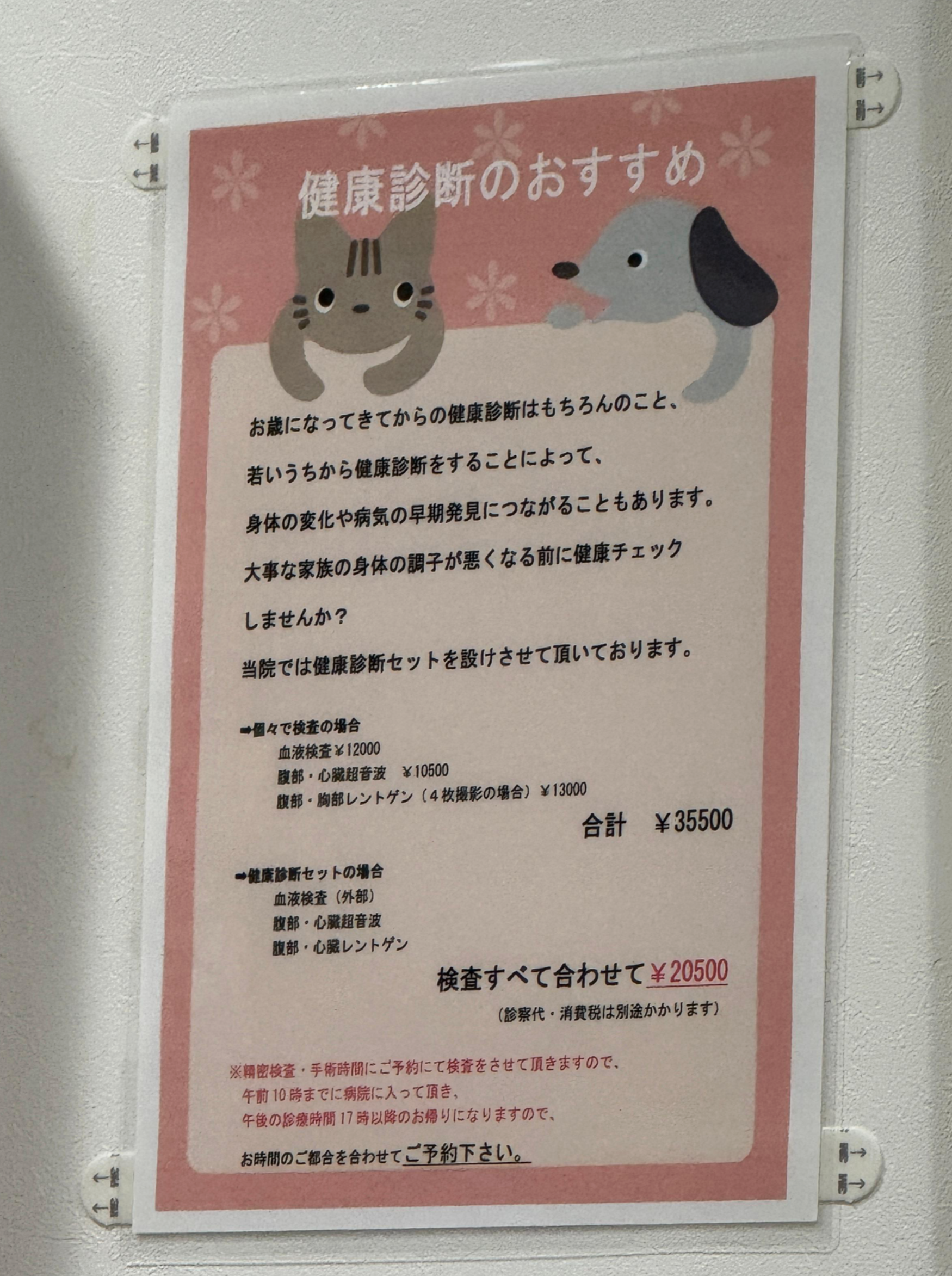 혈액검사, 복부 & 심장 초음파, 복부, 심장 뢴트겐(X선) 검사 세트로 해서 20,500엔