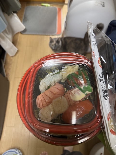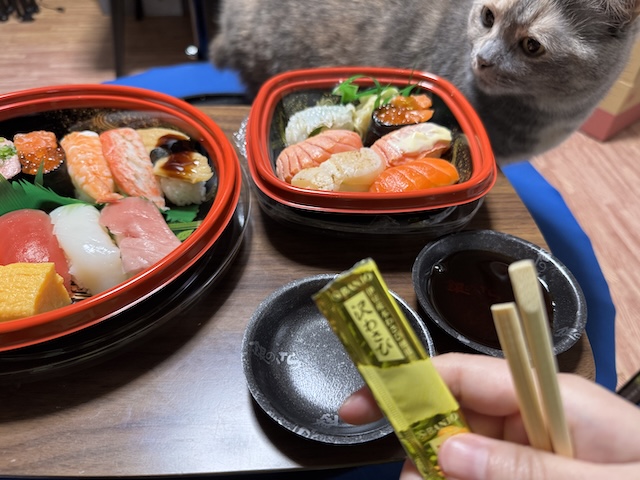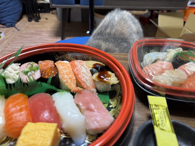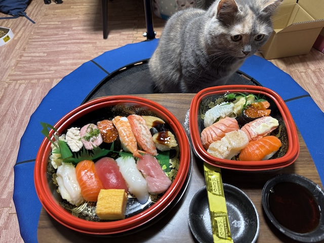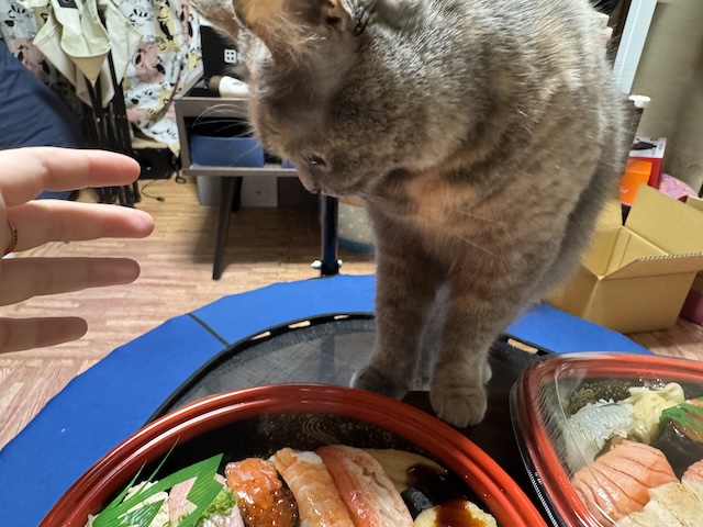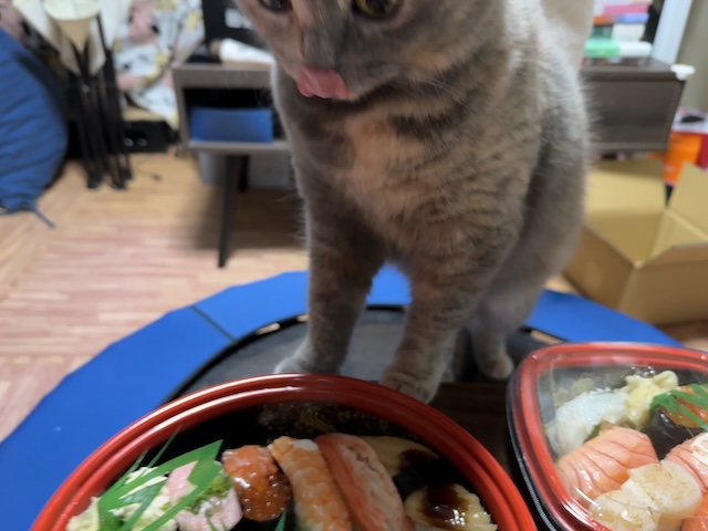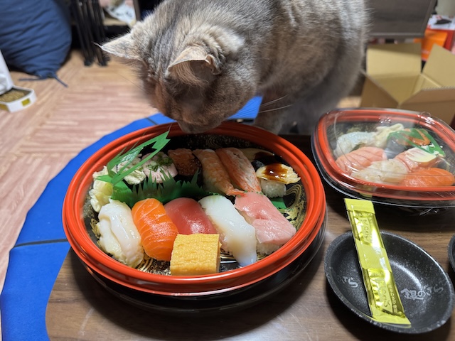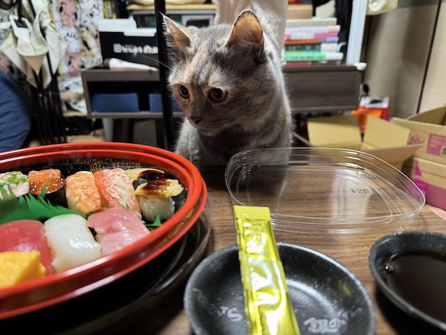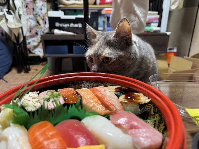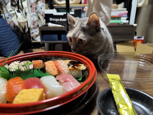 바로 돌진. 집사의 다른 식사에도 와서 킁킁 거리지만 스시는 더 들어오십니다.