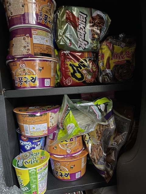 식량 수납장에 다 안들어감 ㅋㅋ 오짬이랑 김치 사발면 죤맛...