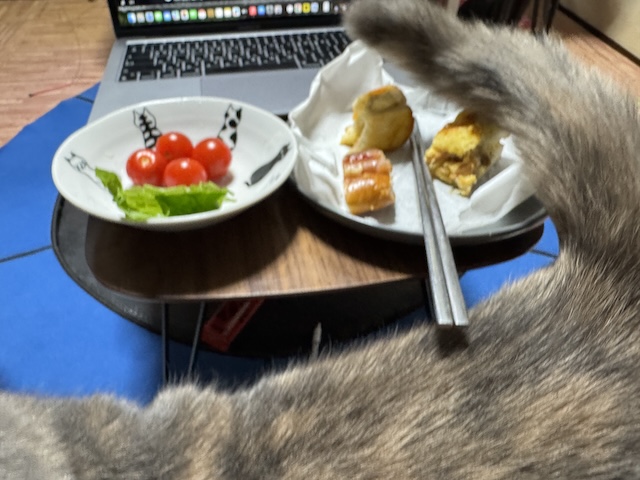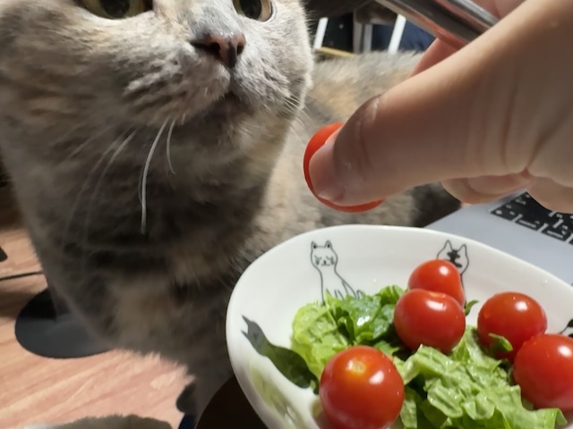 킁킁. 토마토 고양이 줘도 되던가.. 과육만 소량 주는 건 괜찮다 하네요- 먹으려나?