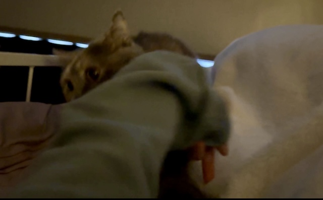 어떨결에 집사 팔 붙잡기