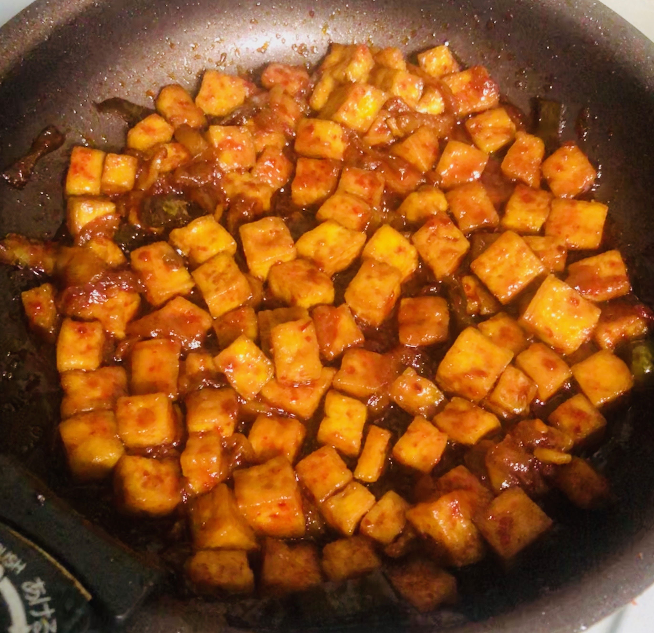 두부 잘라서 튀기고 양파, 청량고추 볶고-