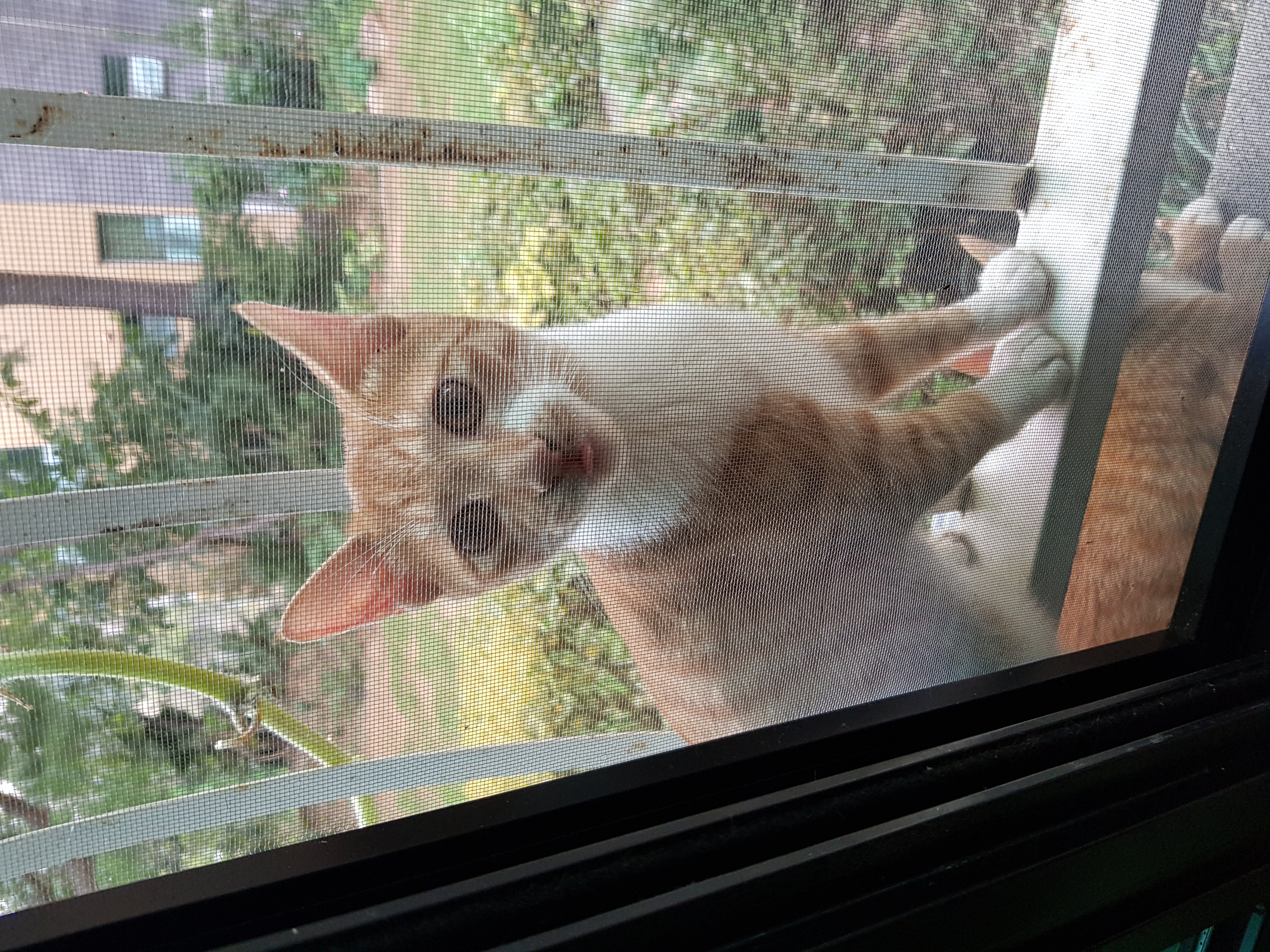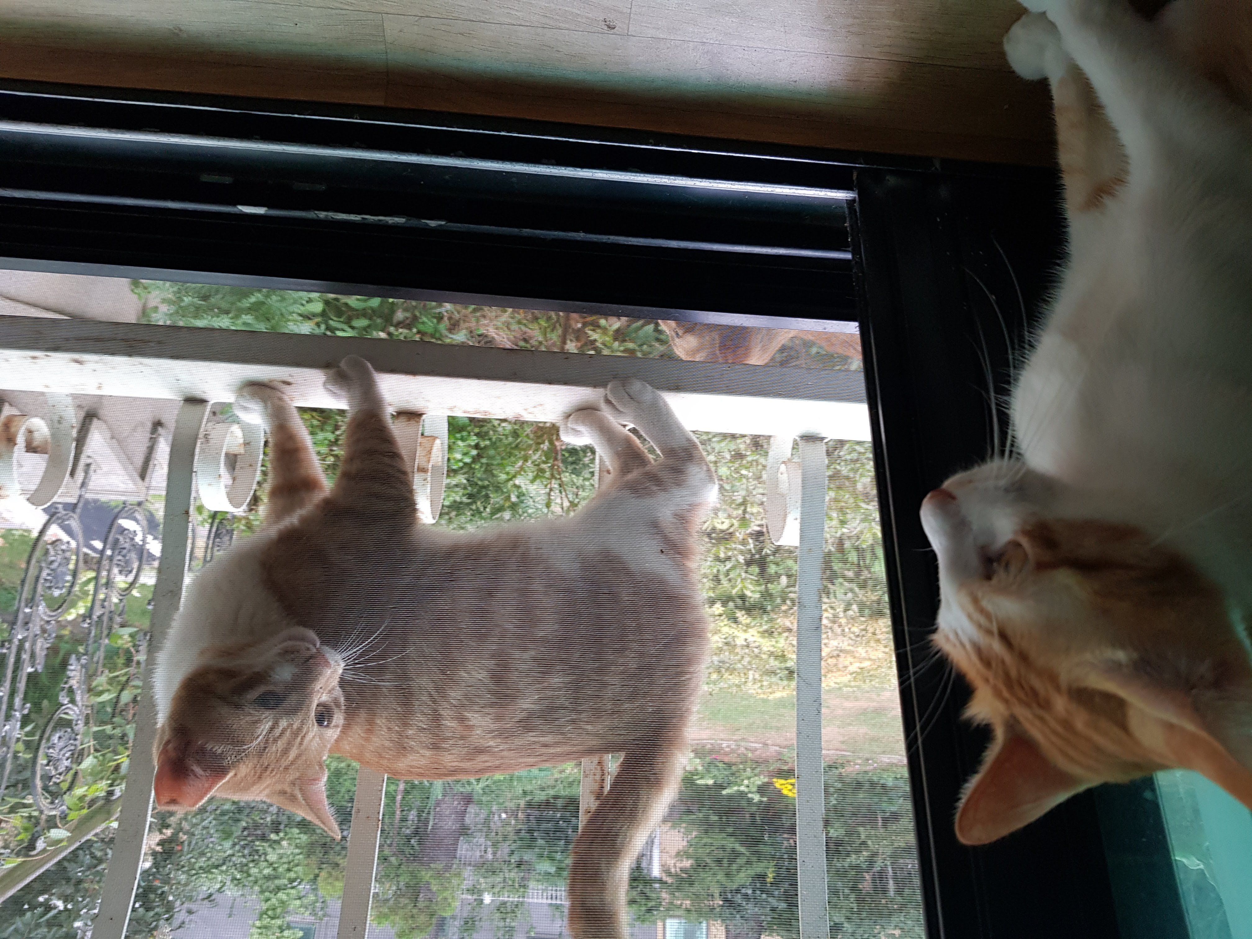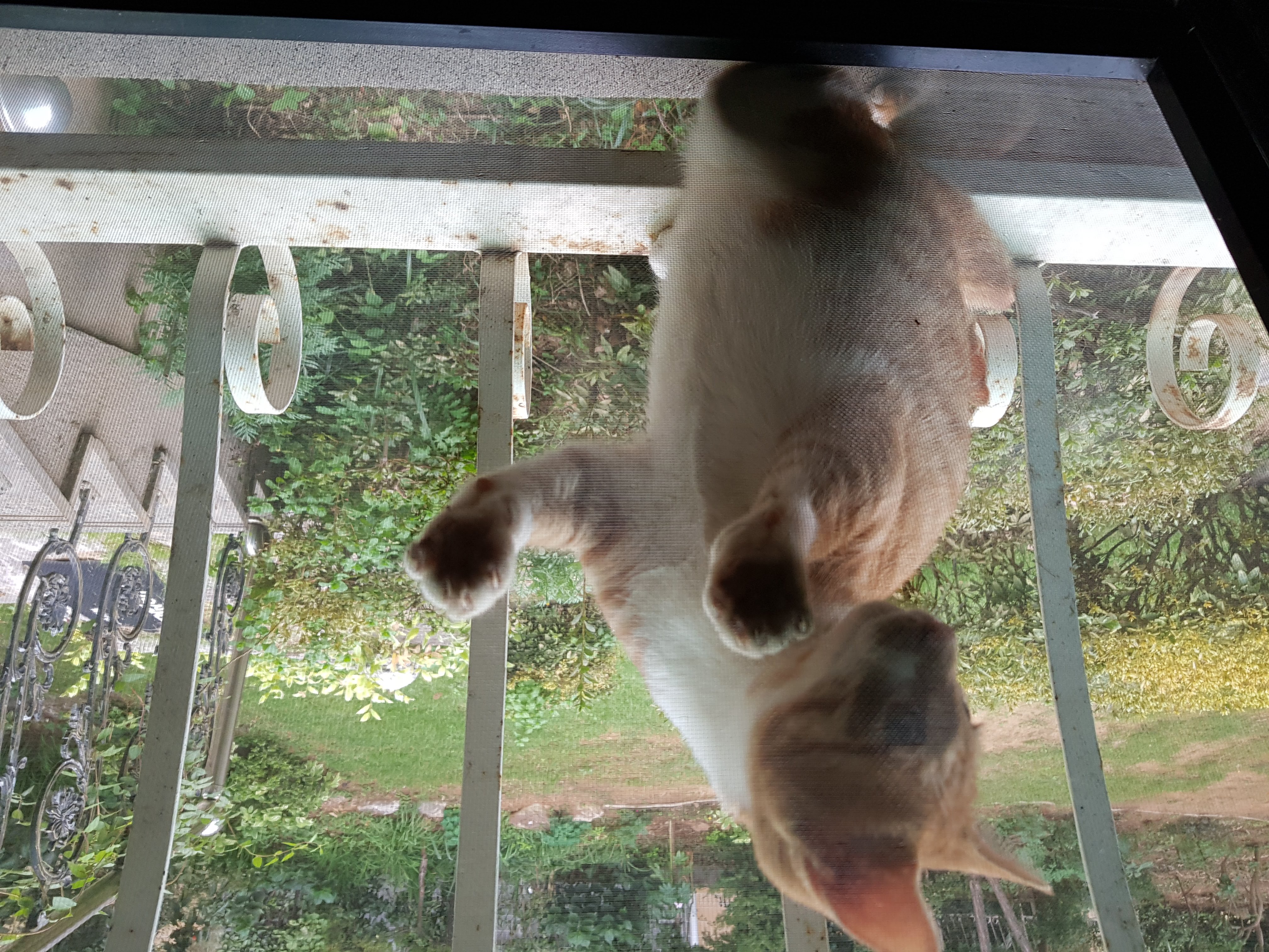 방충망 사이로 접선 중. 자네 이 문 안열어 주겠나