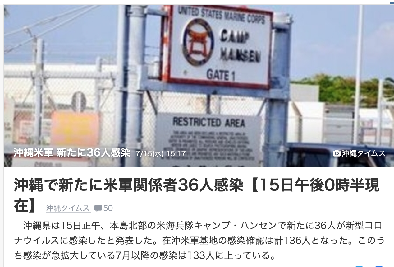 오키나와 미군에서 어제까지 100명의 코로나 확진자 발생,