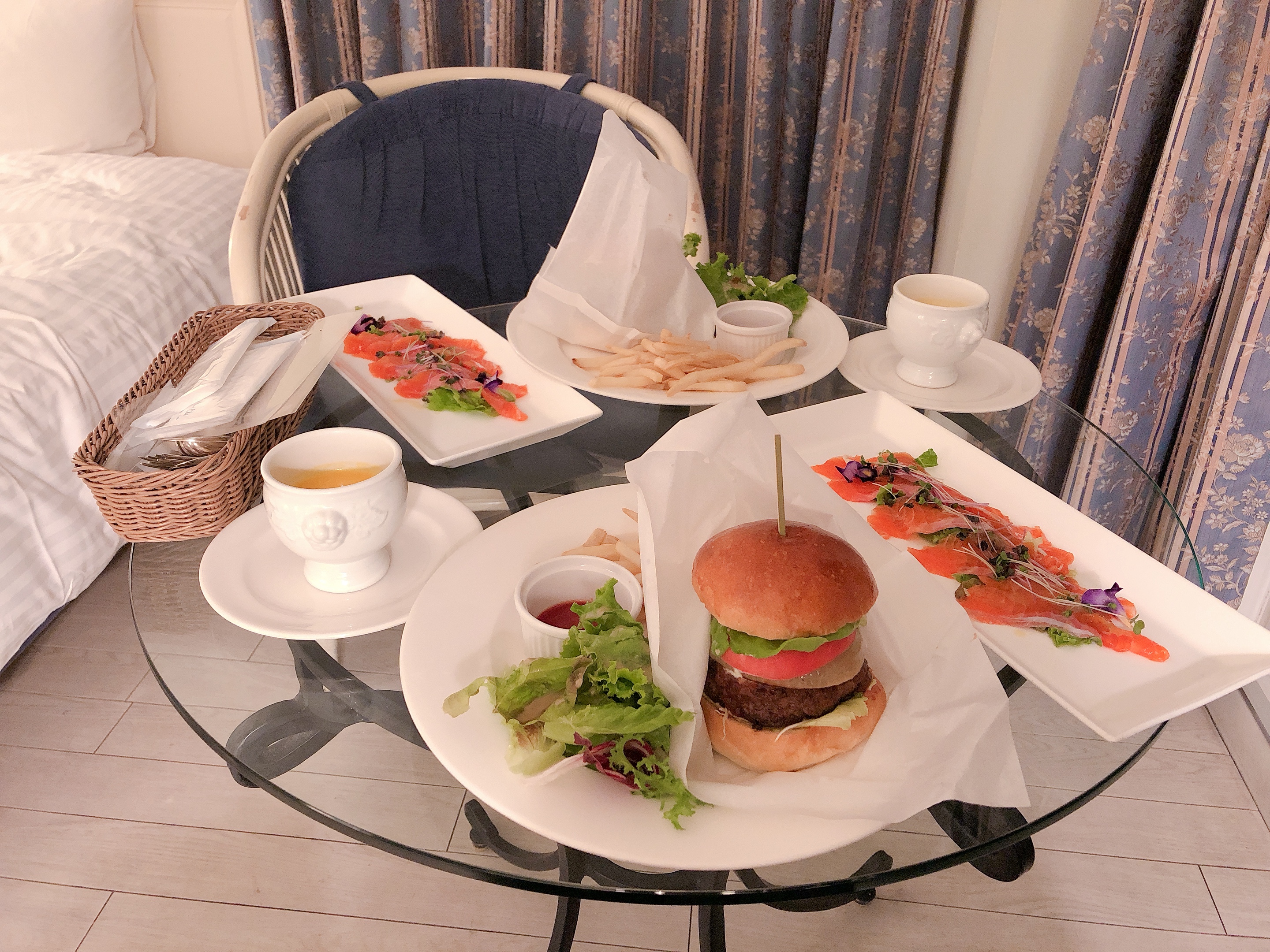 저녁은 방에서. 연어도 나오는건 몰랐어서 기분 좋았음 .