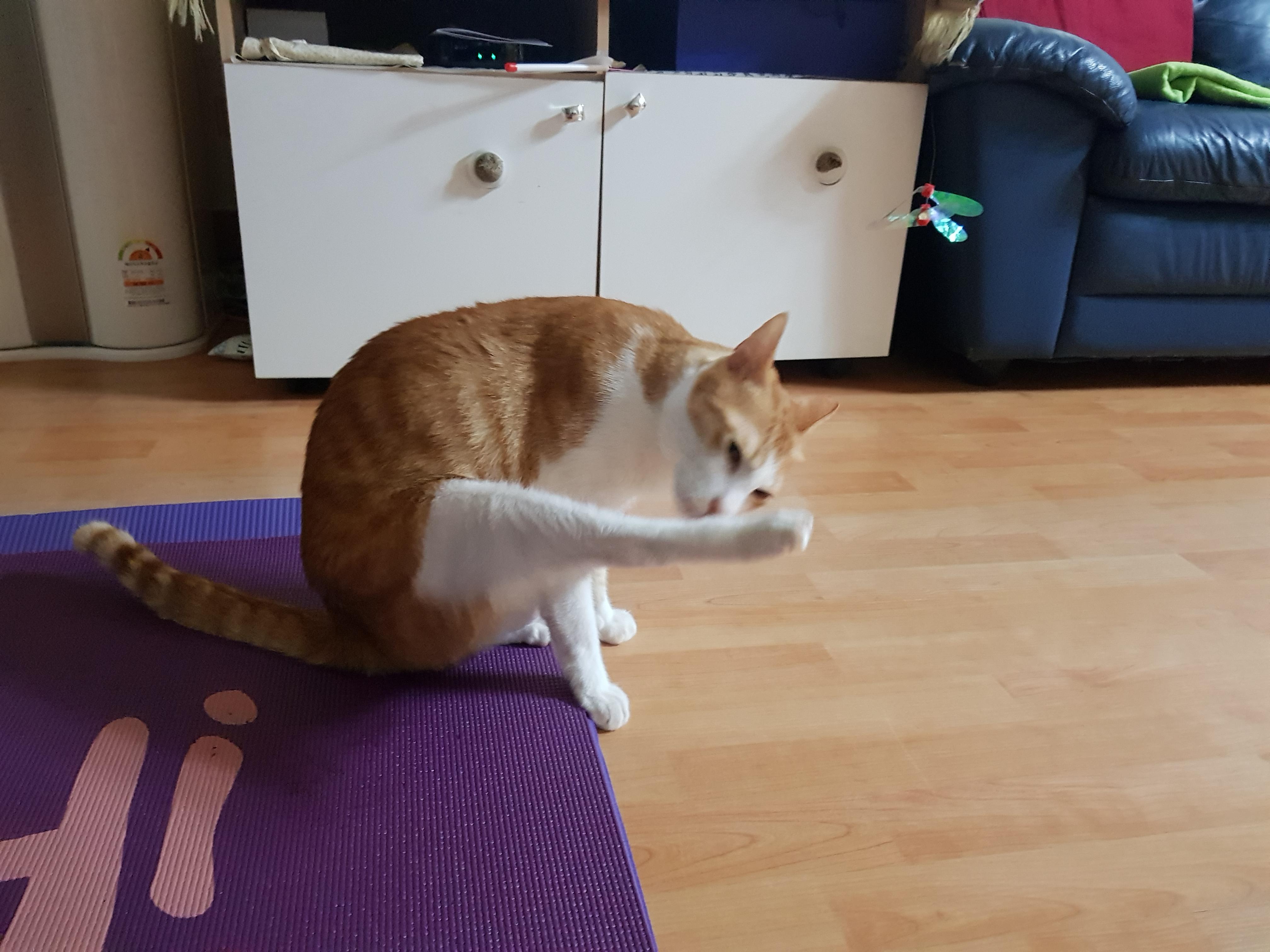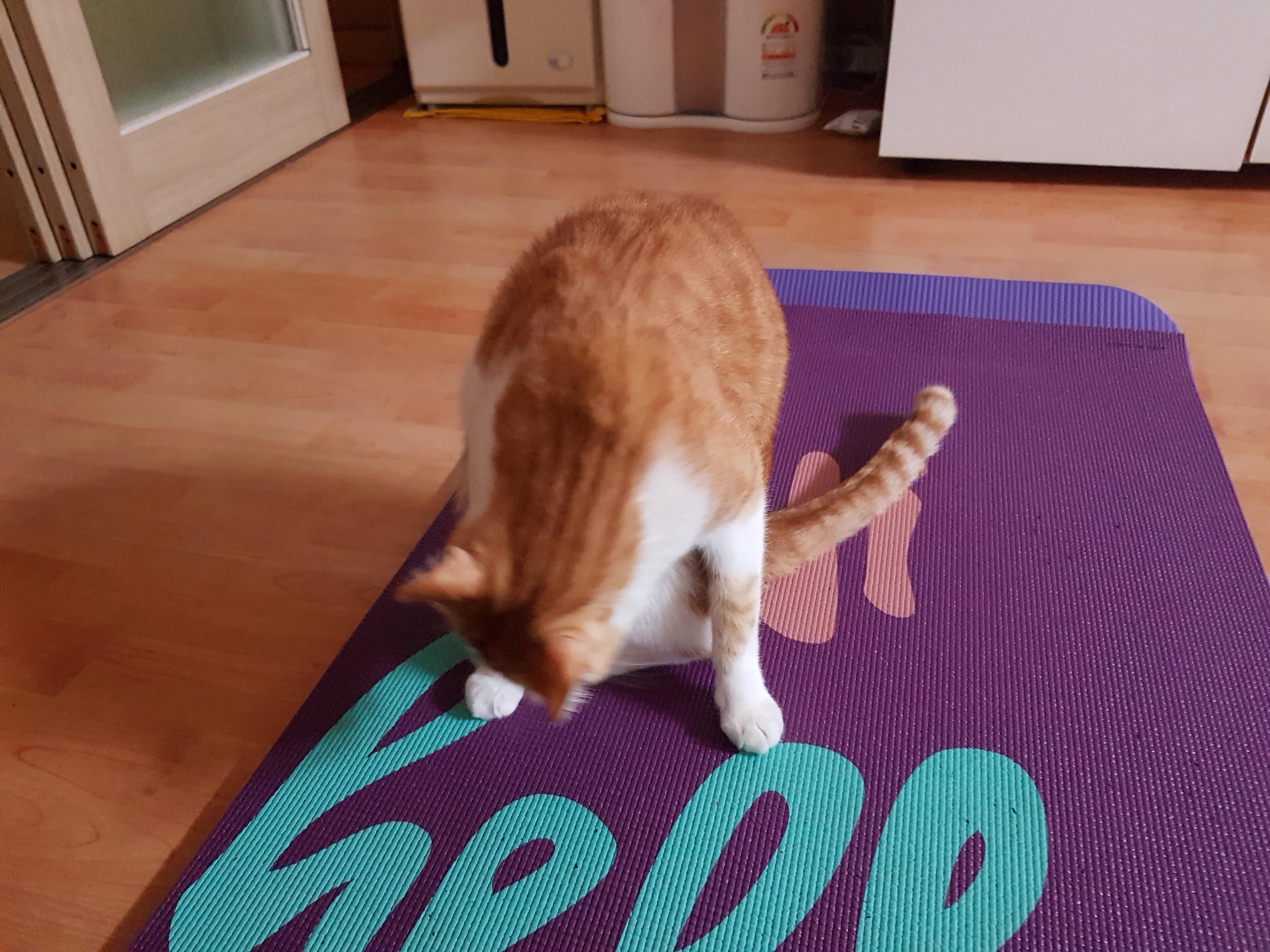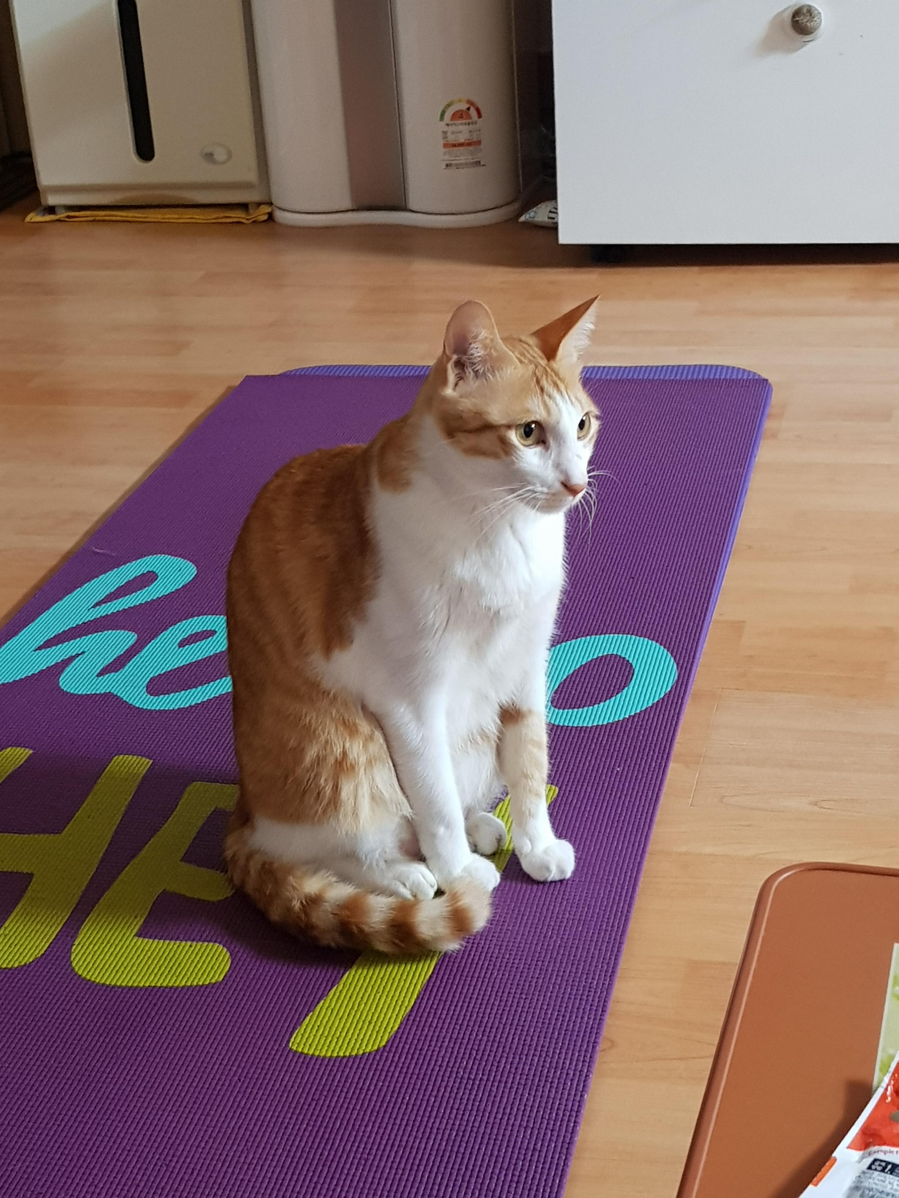 집사가 운동하려 펼친 요가 매트에서 감자 요가 시작