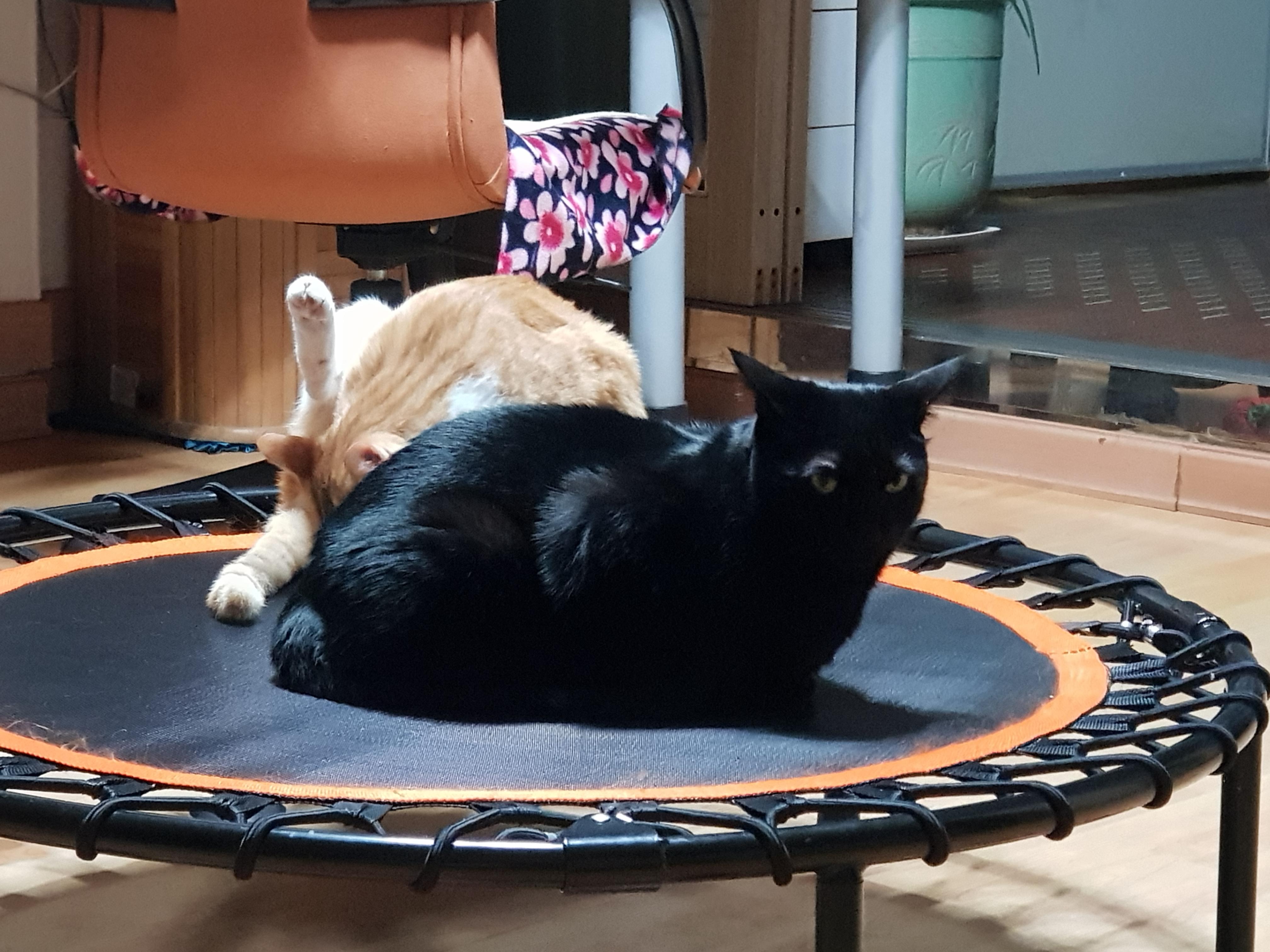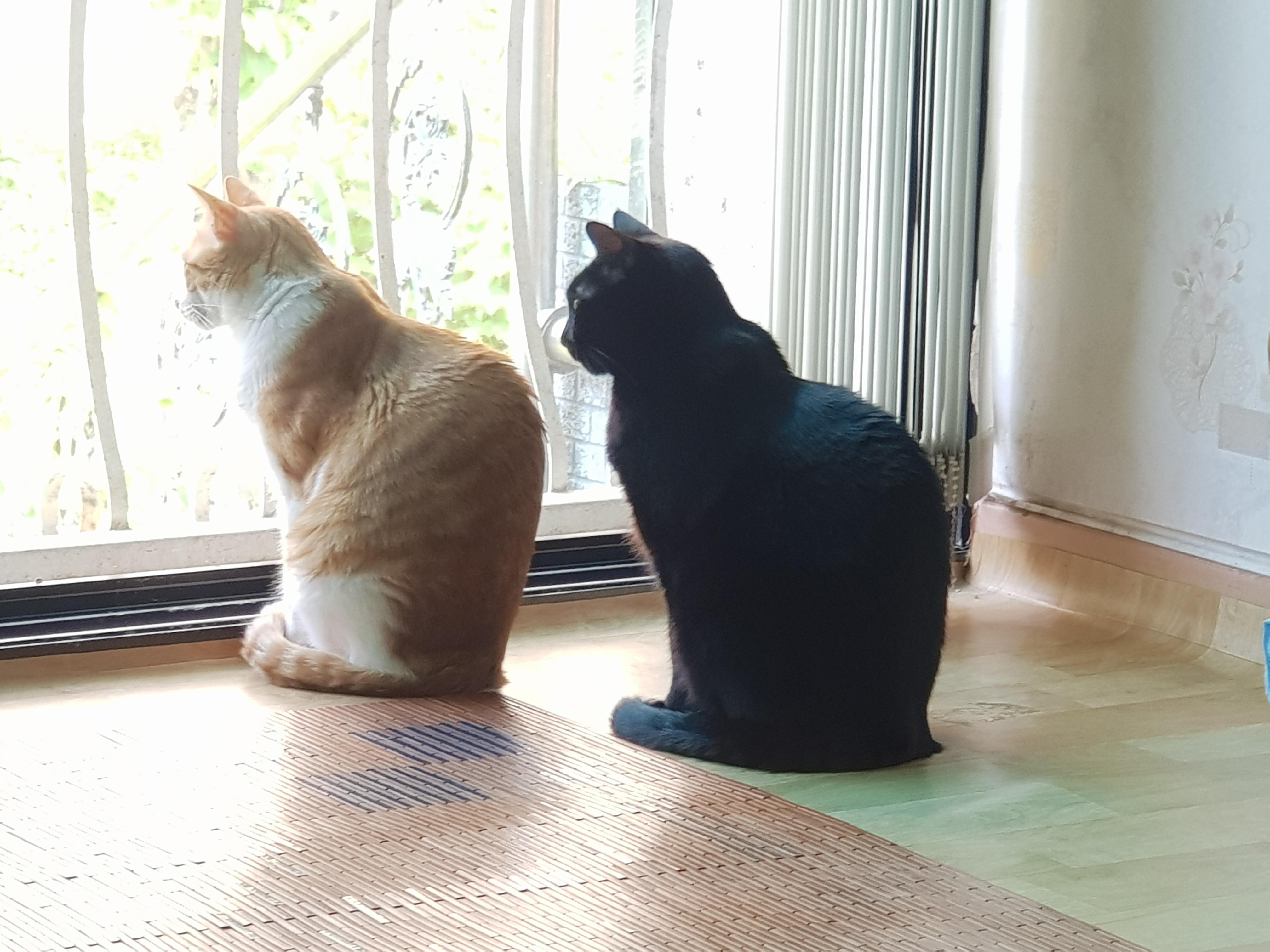 아침. 사이좋게 집사 다리 둘 곳 차지하고 있던