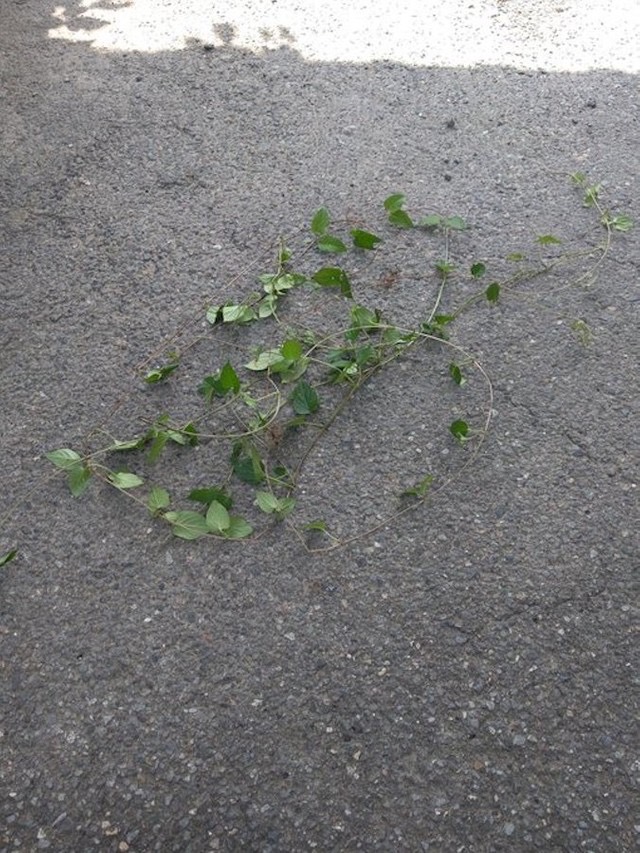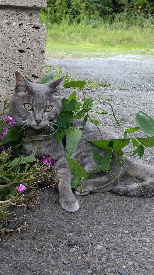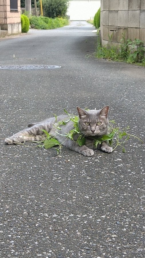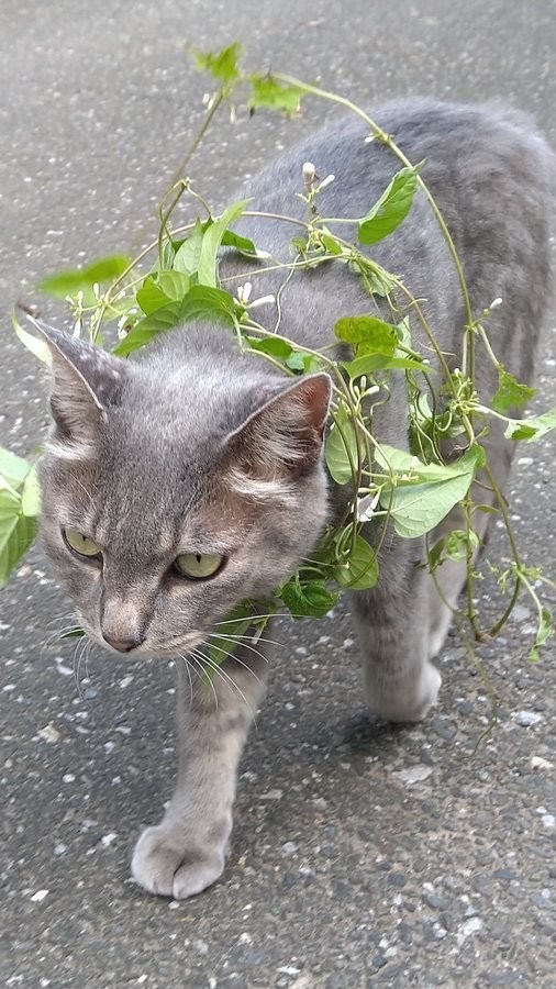 「光合成しながら散歩にゃ」と、家の周りを散歩する愛猫の写真をツイッターに投稿したこまめさん(@koebi_koimo)。そこに写っていたのは、つる草を優雅に身体に巻きつけた、おしゃれな猫